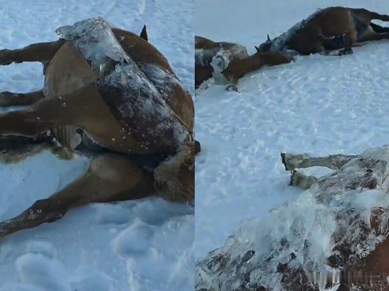 水库冰面下发现13匹冰冻马 12月5日,黑河一处水库冰面下发现13匹被冻死的马匹。知情人称或因马聚集饮水时,冰面未完全冻实导致落水。
