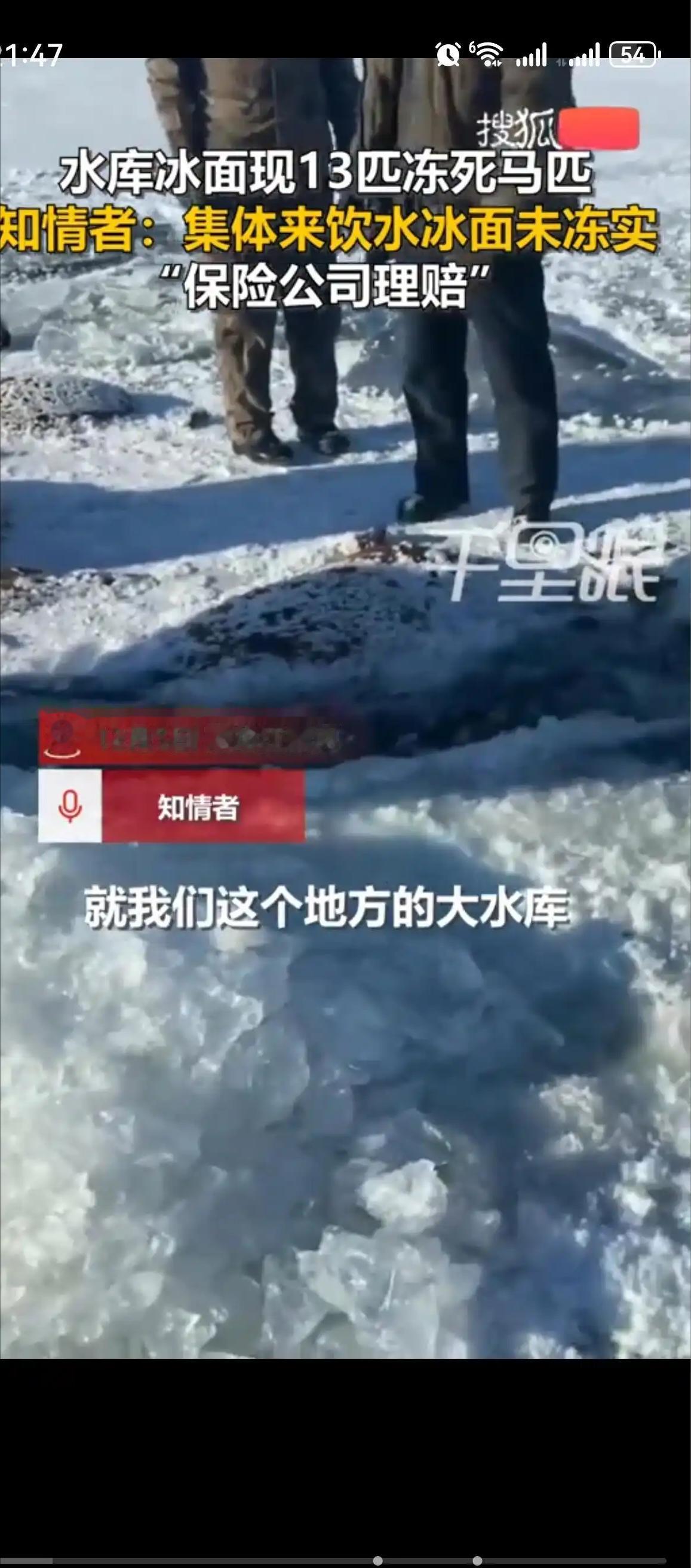 损失30多W!13匹马被冻死!养马大爷欲哭无泪! 近日在黑龙江东风水库冰层中发现13匹冻死的马,究竟 是怎么回事呢?原来是这些马匹扎堆喝水冰面碎裂落水! 现在当地气温零下三十多度,掉下去被冻死了! 后来马主人发现后雇人把冻死的马打捞上来了, 初步估算损失三十多万,大爷指望养马生活呢!养马