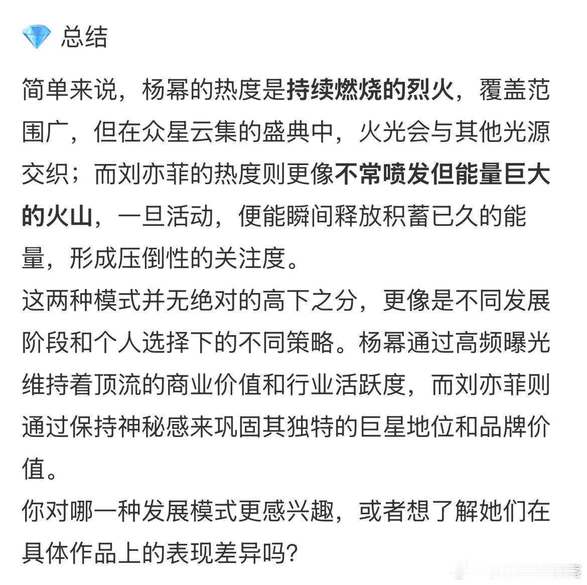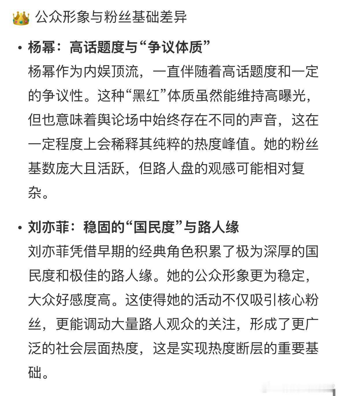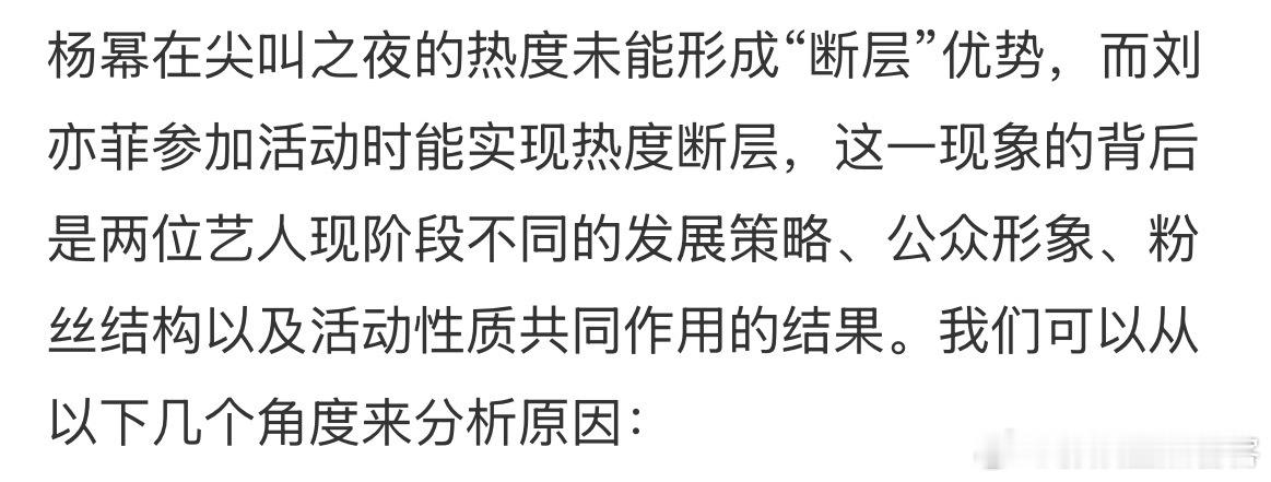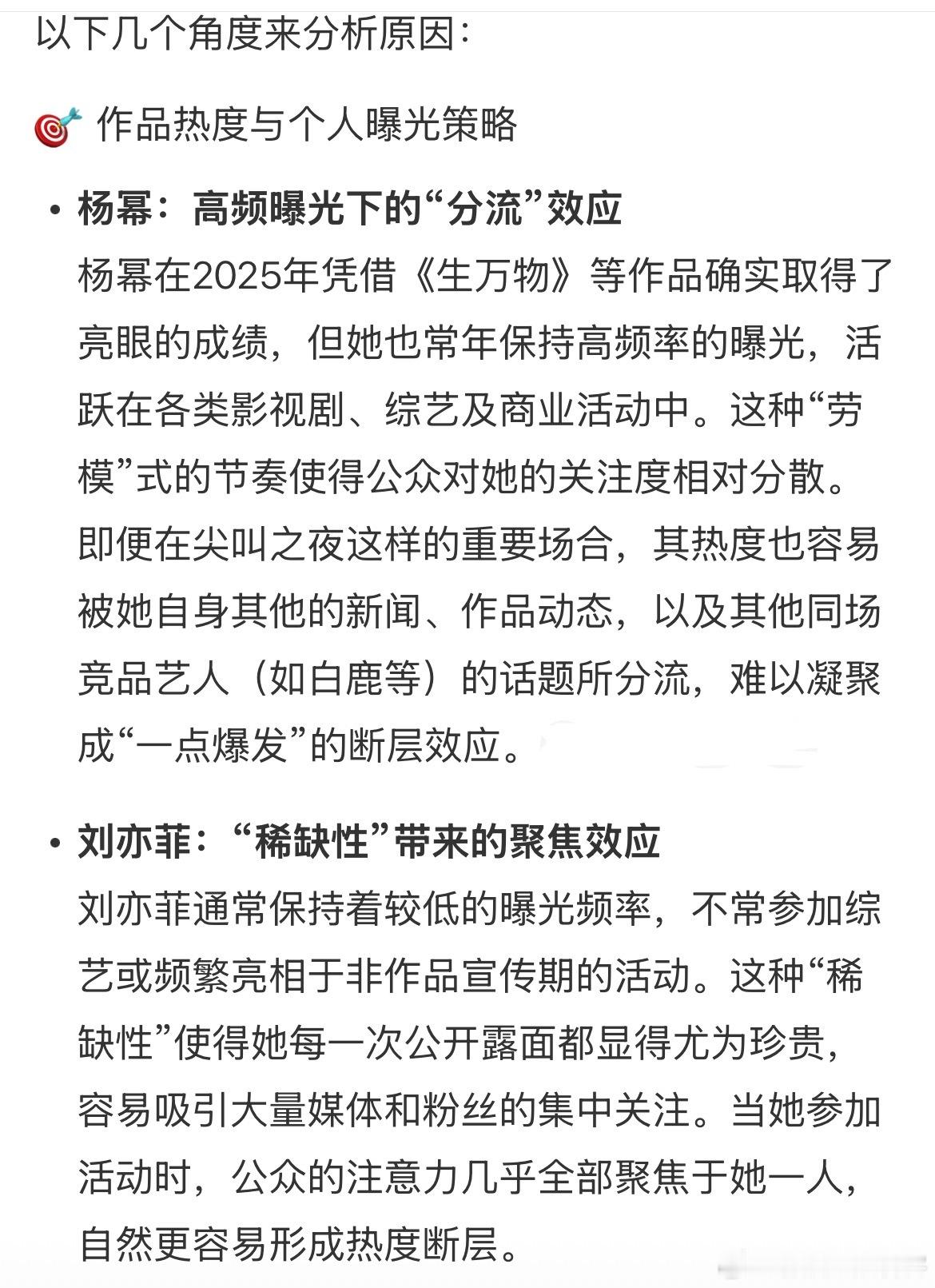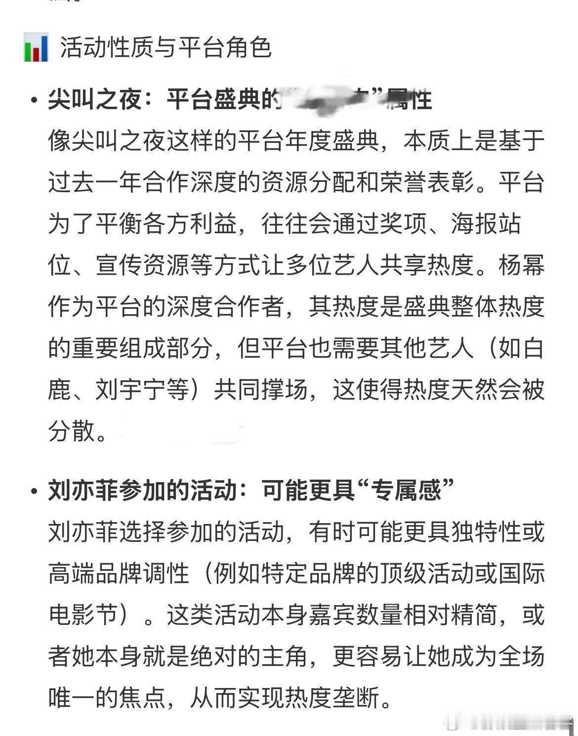 不知道是信息茧房还是什么刘亦菲参加活动感觉基本上整个活动都是围绕她,无论热度还是待遇,还是破圈效果。她都是独一无二的日月。昨晚尖叫之夜杨幂也参加活动了。待遇也挺好的,排面也有,但似乎整个晚上其他人的热度和待遇也可以抗衡,分流严重。没有那种专属感。然后就问了智搜。。你们觉得有道理吗?