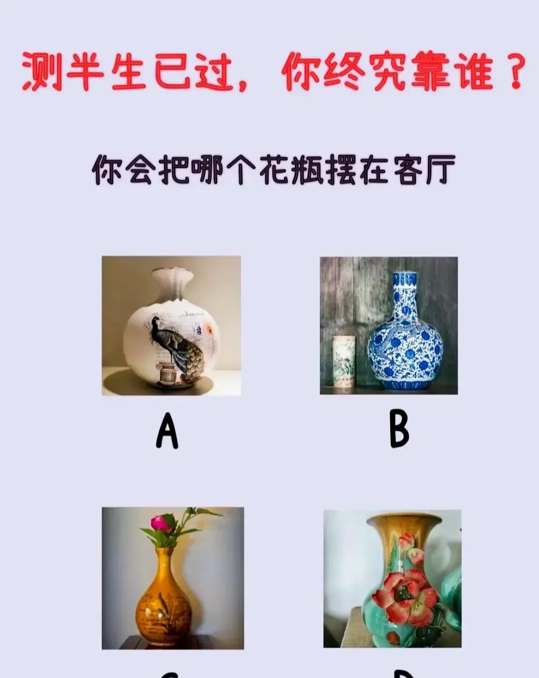 我刷到那个“选花瓶测后半生靠谁”的小游戏,随手点了磨砂玻璃瓶,答案跳出“靠自己”我盯着屏幕愣了两秒,心里咯噔一下。 昨晚刚把工资打给老妈,月初还要交娃的夏令营费,银行卡只剩四位数。 客厅角落那个玻璃瓶里插着上周买的向日葵,已经低头。 我拍照发家庭群,老妈回了个笑脸,老公甩来一句“又信这些”我盯着群聊,忽然明白,所谓靠谁,不过是每天醒来谁在身边给你倒一杯温水。 答案写靠自己,其实是因为没人能替你扛生活的琐碎。 小游戏戳人,是因为它把成年人的孤独包装成选择题。 我们选的不是瓶子,是想要的安全感。