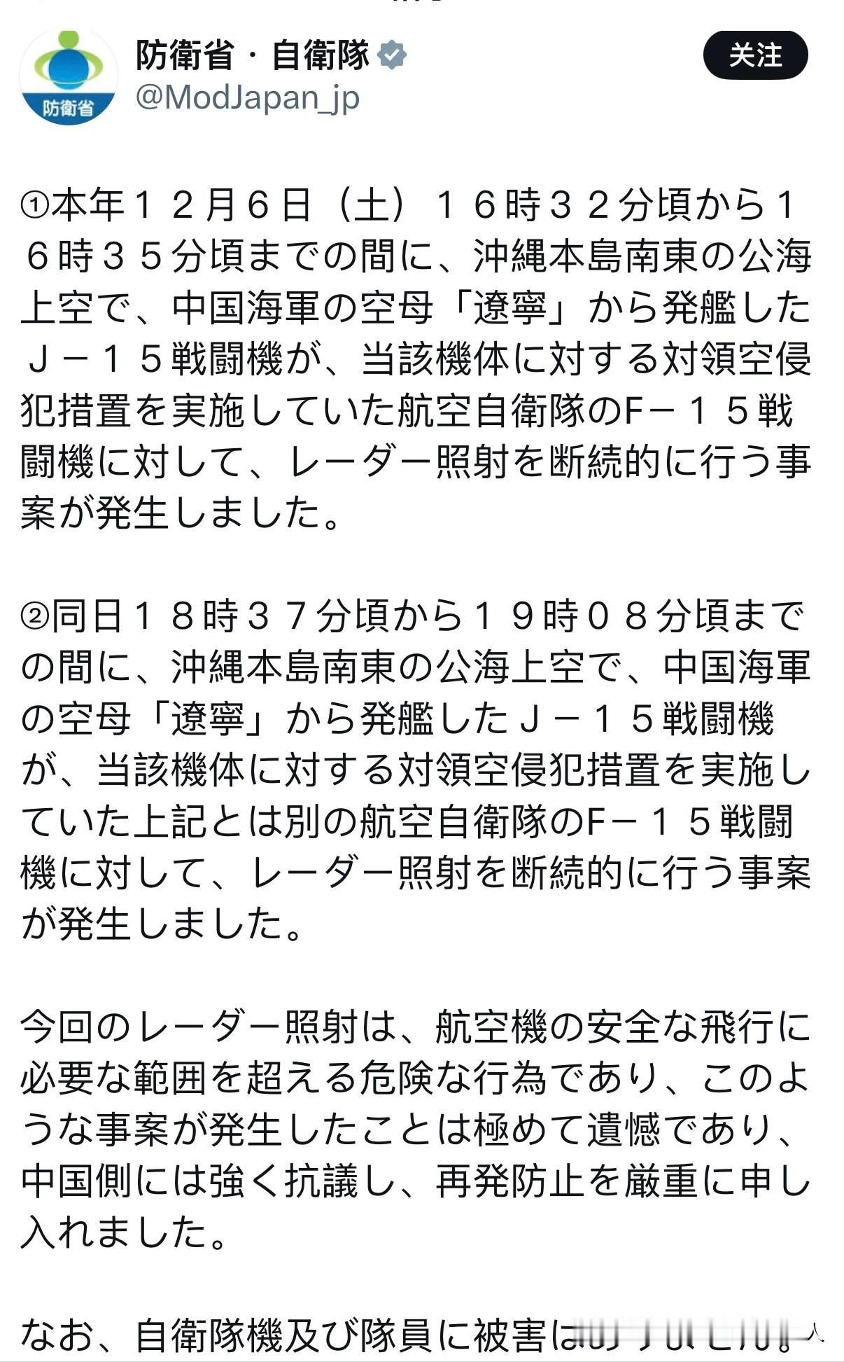 小小泉声称,一架从琉球群岛附近辽宁号航母起飞的J-15,开火控雷达照了日本空自的F-15 !说明日本的战机也开了火控雷达的啦! 本来就是在公海上空,你F15J,我J15,照你一下咋地了,航行自由懂不懂,这个小小泉某次郎叫什么叫呢! 歼-15舰载机