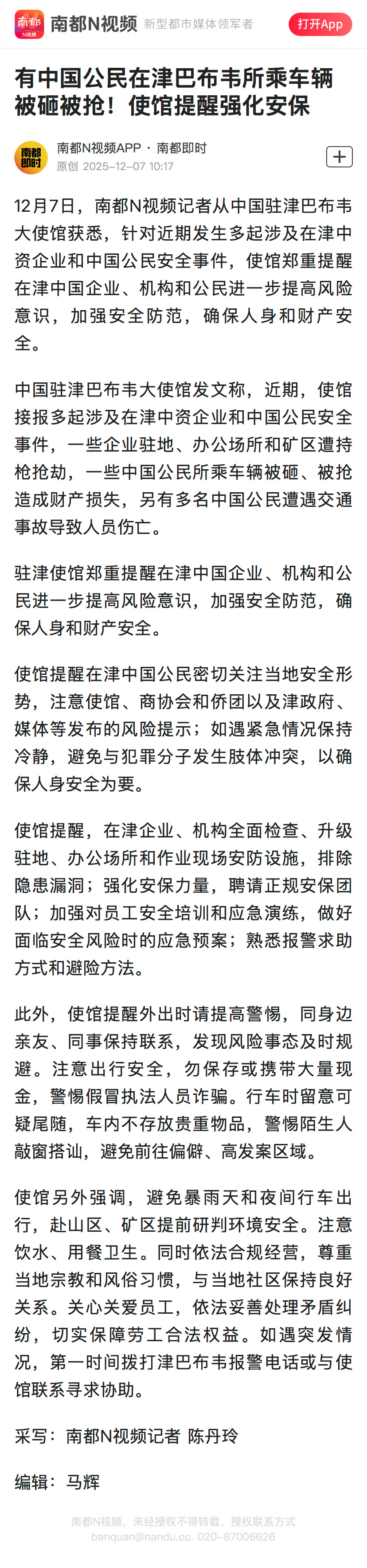 #津巴布韦发生多起涉中国公民安全事件#【有中国公民在津巴布韦所乘车辆被砸被抢!使馆提醒强化安保】#中国驻津巴布韦使馆紧急安全提醒#12月7日,南都N视频记者从中国驻津巴布韦大使馆获悉,针对近期发生多起涉及在津中资企业和中国公民安全事件,使馆郑重提醒在津中国企业、机构和公民进一步提高风险意识,加强安全防范,确保人身和财产安全。南都N视频记者 陈丹玲