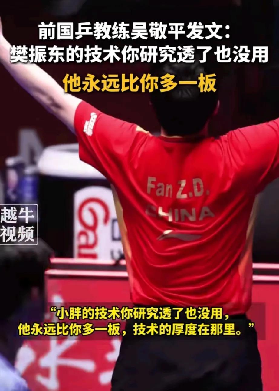 杀人诛心! 前国乒教练“吴敬平”高调发文称:“樊振东的技术你研究透了也没用,他永远都比你多一板”。 短短的一段话,胜过了千言万语,比什么世界第一都要霸气,这句“永远都比你多一半”,简直就是无敌的存在。 这次的高调发文,尤其是换一句“永远都比你多一板”,肯定会让很多人汗颜,但老爷子他不在乎,因为他在乎的只有自己这个得意门生,“樊振东”! 吴敬平去过新加坡做教练,核心执教经历是退休后担任新加坡乒乓名将冯天薇的私人教练。 结束与冯天薇的合作后,吴敬平选择回国投身乒乓球基层推广,签约安徽黄山乒乓球基地,参与教练员培训、青少年指导等工作,重心从海外个人执教转回国内乒乓事业传承。 令人敬仰的功勋教练,培养了多名乒坛高手,成就辉煌。他的得意门生 ,关门弟子樊振东更是了得,不仅球技顶尖,更难能可贵的是敢多一半不正之风。真可谓名师出高徒也!