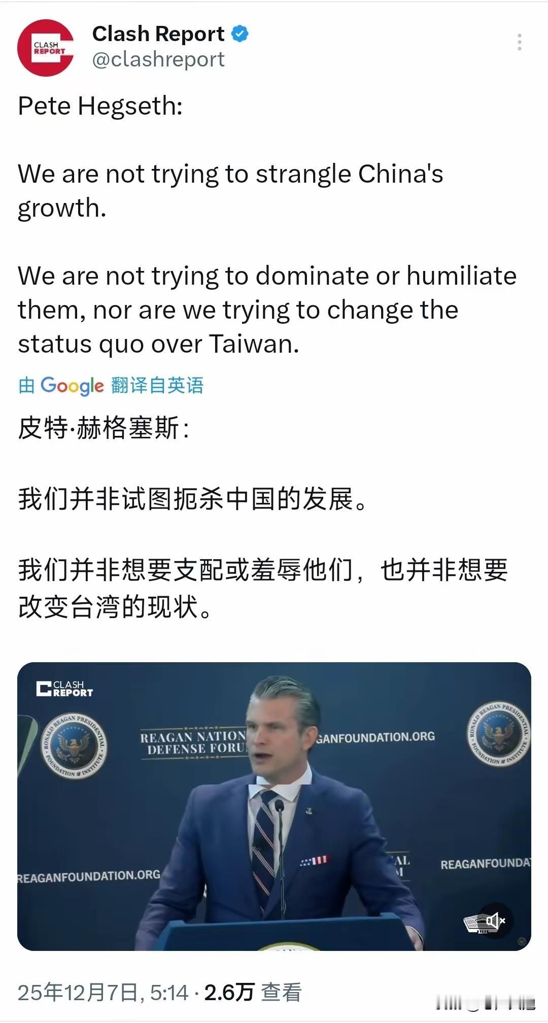 那么你们究竟想干什么?美国战争部长赫格塞斯在12月7日表示:“我们并非试图扼杀中国的发展。我们并非试图支配或羞辱他们,也并非想要改变台湾的现状。”我想问问你,你的所作所为究竟想干什么吗?对中国禁售高端芯片,对台湾出售武器,这些难道还不够吗?还口口声声站在道德的制高点说什么并非,真是恬不知耻,西方的政客向来口是心非,睁眼说瞎话,满口仁义道德,却干着下三滥的事,现在你们的实力已经不足以欺负中国,但是惯性思维还想搅和,等待你们的只能是狼狈不堪、连滚带爬!