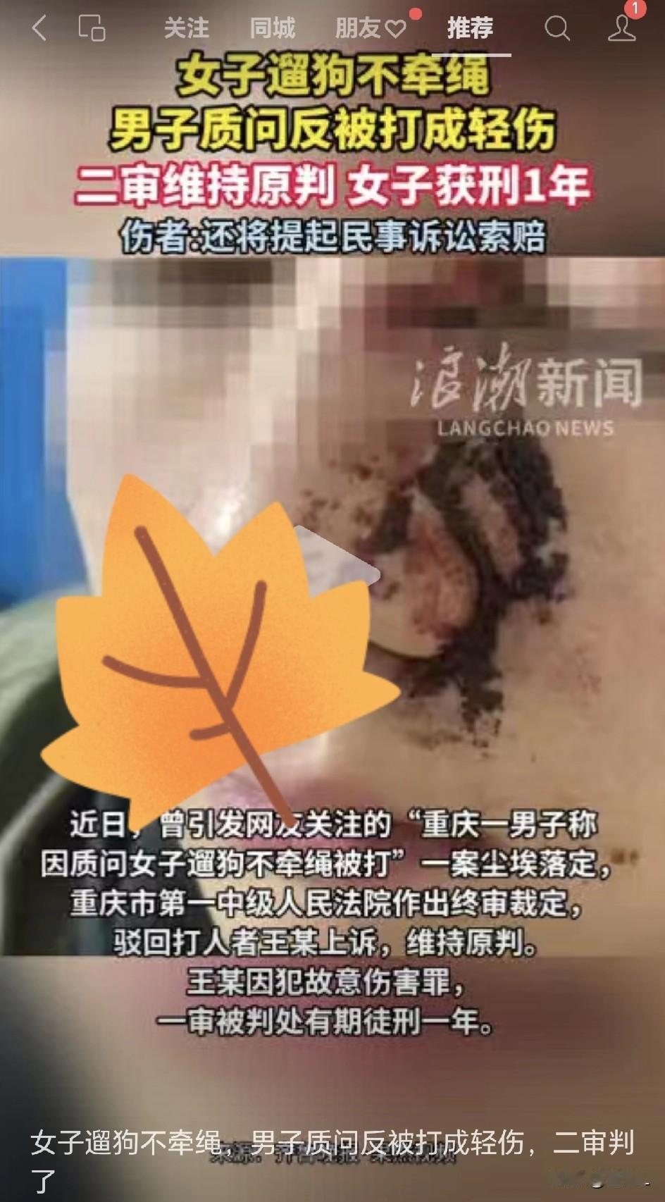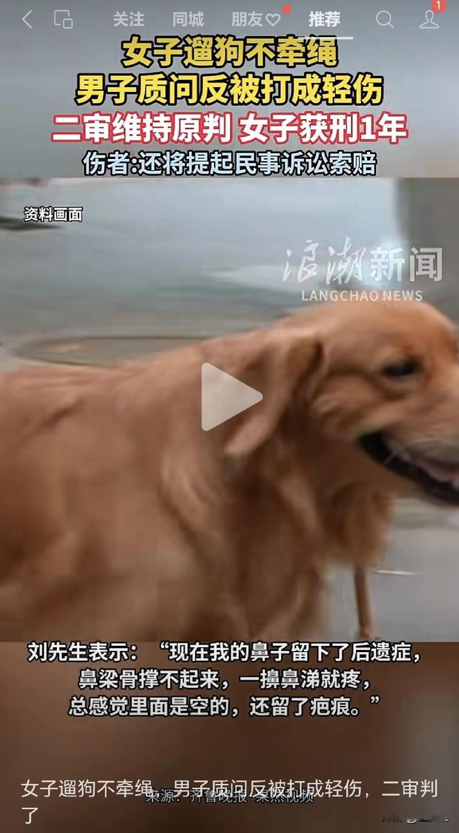 遛狗不牵绳还打人!女子用手机砸断对方鼻梁,获刑一年! 遛狗不牵绳,狗吓到了人,不仅不道歉,反而一巴掌扇过去,还抢过对方手机直接砸脸上——这不是电视剧,而是发生在重庆的真实一幕。 今年2月24日晚上,重庆某小区里,王某遛狗没牵绳,她的狗和另一只也没牵绳的狗一起追向路过的刘先生,吓得他当场摔倒。 刘先生站起来后,还算冷静,只是提醒王某:“麻烦把狗绳牵一下吧。” 没想到这一句话,直接点燃了王某的火气。 她冲上去就是一耳光。刘先生拿起手机想录像留证,王某竟一把抢过手机,狠狠砸向他面部! 这一砸,砸出了鼻骨骨折、鼻中隔损伤,鉴定为轻伤二级。 遛狗的王某,一巴掌加一手机,把自己“砸”进了监狱。 事后,刘先生不仅鼻子留下功能性后遗症,还确诊了创伤后应激障碍和焦虑抑郁。 而打人的王某,一审被判有期徒刑一年。她不服上诉,结果2025年11月24日终审维持原判:一年刑期,坐牢没商量。 事情还没完。 刘先生已准备提起民事诉讼,向王某索赔医疗费、精神损失等费用。 一巴掌,一冲动,换来的是牢狱之灾+经济赔偿+一辈子的人生污点。 很多网友说: “遛狗不牵绳本来就不对,还动手打人,判得好!” “现在很多纠纷都是因为遛狗不牵绳引起的,真该管管了。” “支持严惩,法治社会不是谁凶谁就有理。” “一年太轻了!” “应该判个十年八年的!” “感谢男子把她送进去,让其它人遇不到这样的人!” “严惩重罚才能根治!” “文明养犬任重而道远!” “我也养狗,但这样的养狗人,真的没教养!” 这件事也再次提醒所有人: 遛狗牵绳,是规矩,更是公德。 发生矛盾,动手是最蠢的选择——打输住院,打赢坐牢,从来不是一句玩笑话。 --- 你身边有不牵绳遛狗的情况吗? 遇到类似冲突,你觉得该如何冷静处理?评论区一起聊聊。 信息来源于浪潮新闻,侵联删!