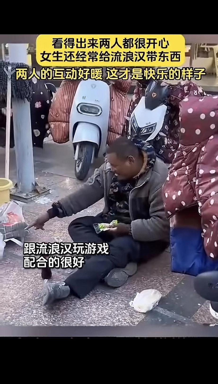 女生经常路过某条马路时,总会给那位流浪汉带点吃的。这天她没急着走,而是掏出手机,记录两人玩起了小游戏。 你一手我一手,配合得还挺默契。玩到精彩处,两个人都笑得特别开心——一个是天天见面的陌生人,一个是无家可归的流浪者,此刻却像老朋友一样自在。 原来快乐这么简单,不需要刻意做什么。一点善意,一点陪伴,就能让两个截然不同的人都发自内心地笑起来。这画面真暖。