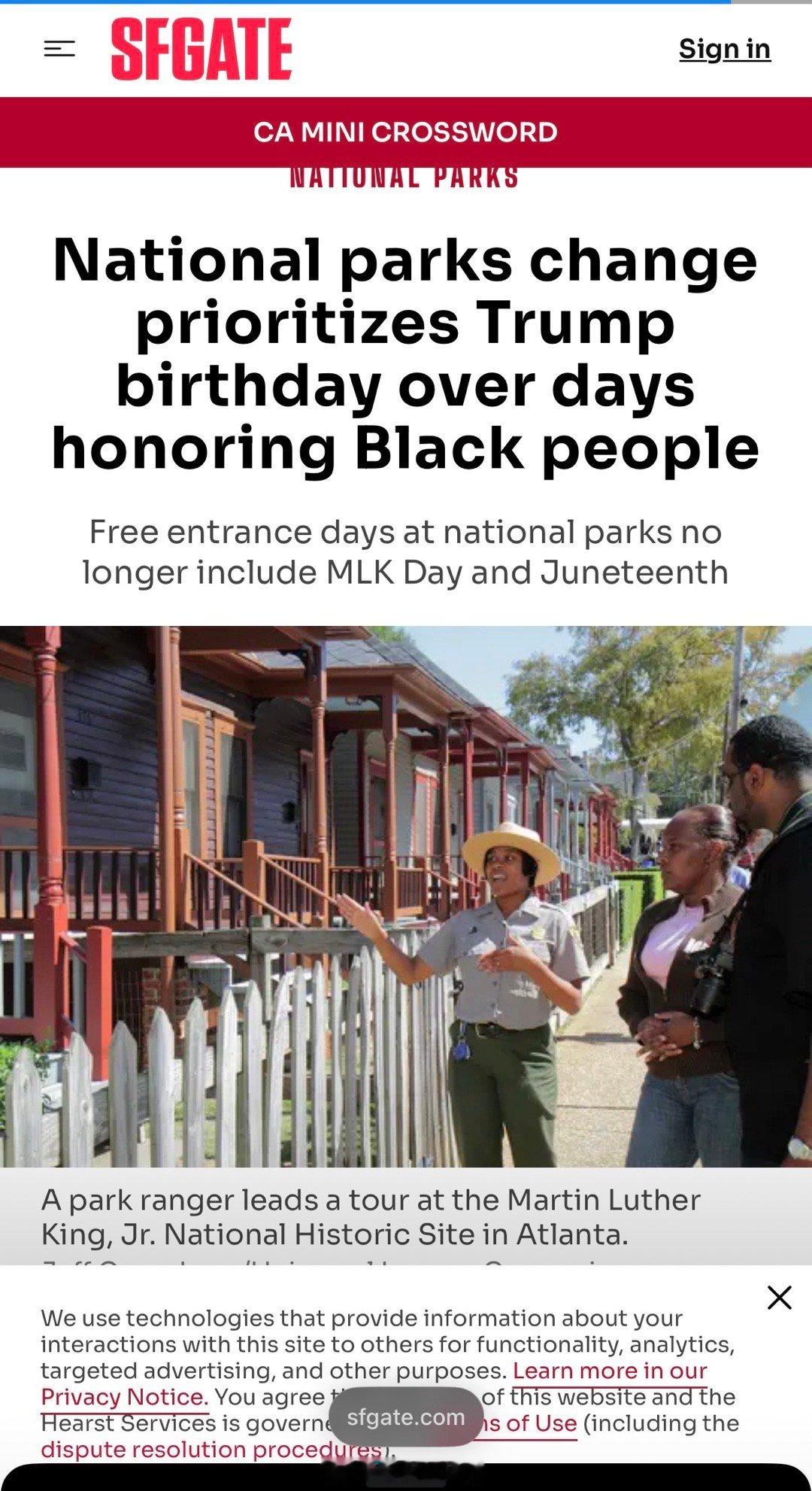 美国政府调整了国家公园的免费入园日,移除了两个纪念黑人的节日,但添加了特朗普总统的生日。116个美国国家公园今年将不在马丁·路德·金 日或六月节(Juneteenth)——一个纪念黑奴解放的联邦假期——免费开放。然而,特朗普6月14日的生日已被添加到免费入园名单中。根据美国国家公园管理局(National Park Service),公园收取的入园费从3美元到30美元不等。2026年的其他免费入园日包括总统日(华盛顿总统生日)、阵亡将士纪念日、独立日周末、国家公园管理局的110周年生日、宪法日、西奥多·罗斯福总统生日以及退伍军人日。除了马丁·路德·金 Jr. 日和六月节外,国家公共土地日(National Public Lands Day)和《伟大美国户外法案》(Great American Outdoors Act)周年纪念日也被移出了免费入园日。