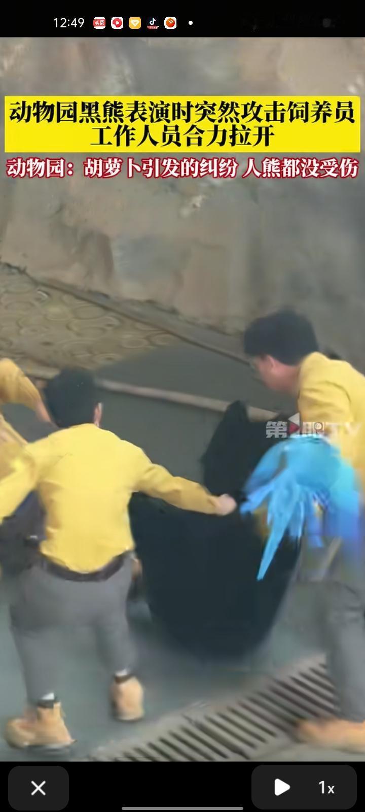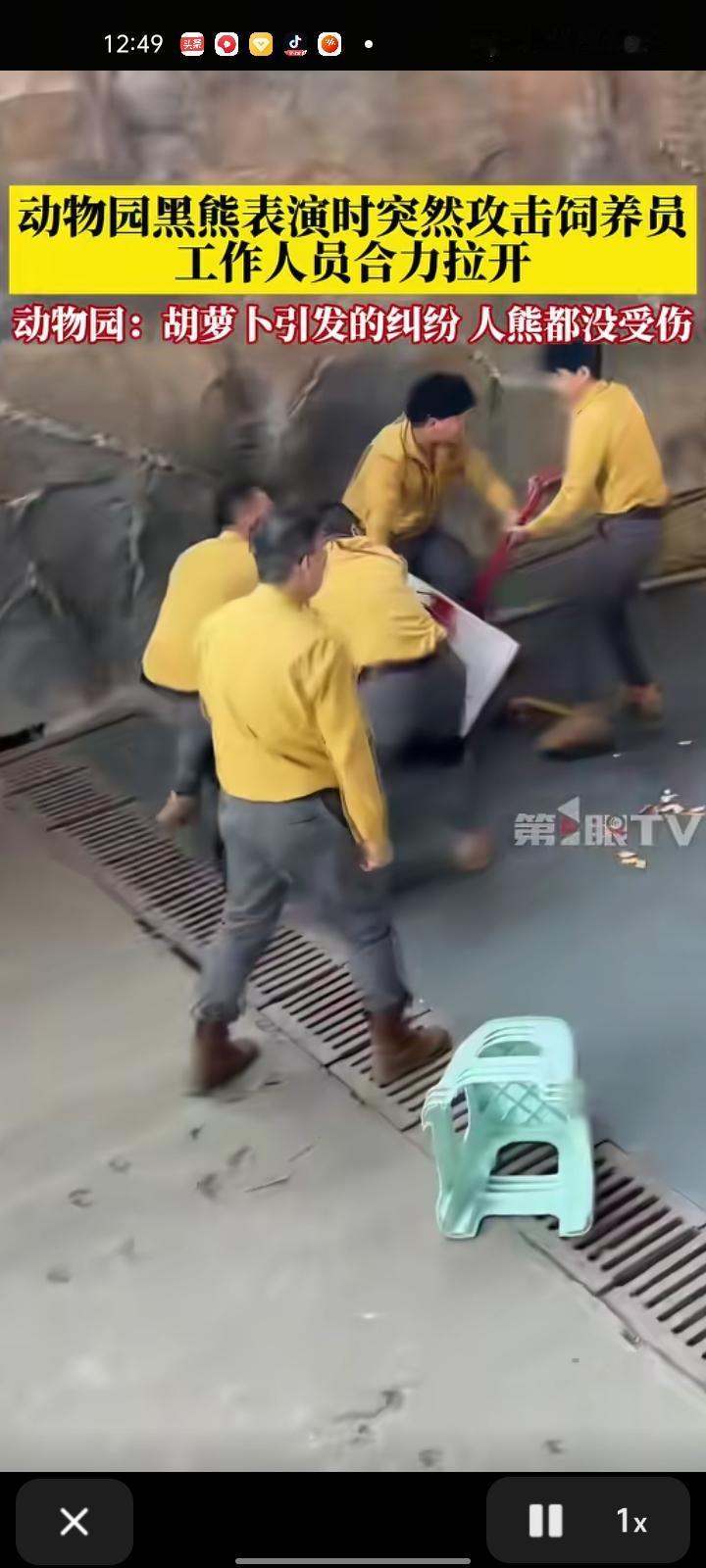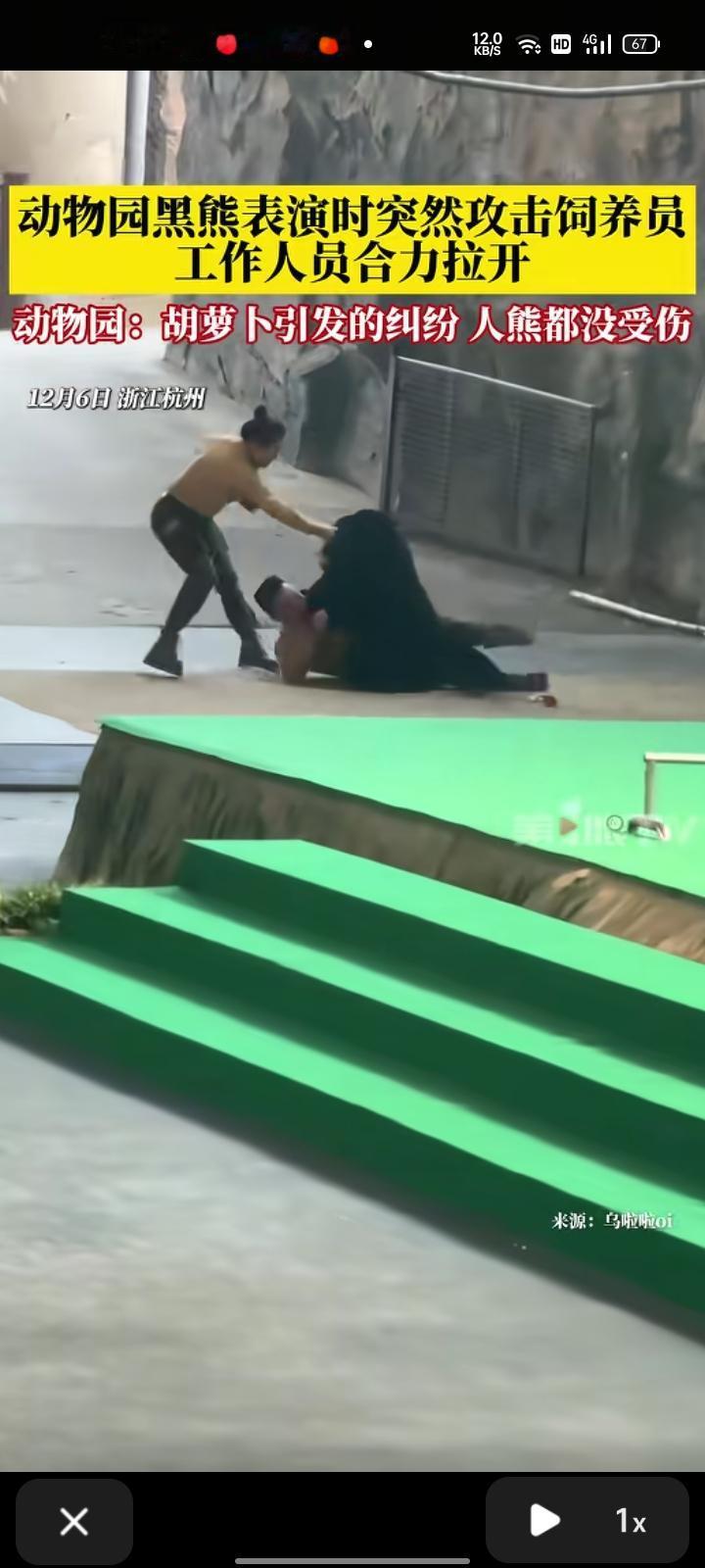 12月6日,浙江杭州。多位网友晒视频称,动物园黑熊表演时,黑熊突然攻击饲养员,只见工作人员用棍子敲击黑熊,另外几个合力拉开。 饲养员回应称,因为随身带了胡萝卜,黑熊比较贪吃就上来了,人和熊都没受伤。