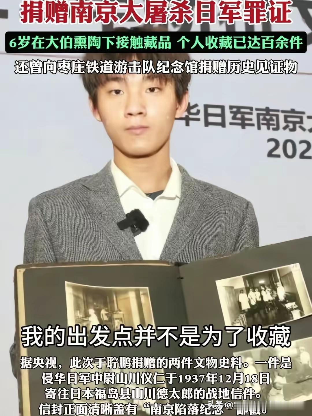 这下好了, 不止江苏知道了,全网都知道了, 一个15岁高中生网购日军侵华相关史料并且直接捐给了纪念馆。 这个叫于聆鹏的少年,愣是把同龄人用来追爱豆、打游戏的时间和零花钱,都花在了收集这些沉甸甸的历史物证上。15岁的年纪,本该是趴在课桌上偷偷传小纸条、放学约着吃烤肠的年纪,他却能对着泛黄的战地信件、带着岁月痕迹的老照片,一字一句去核对1937年的南京往事,这份清醒和敬畏,比多少成年人的“佛系”都来得珍贵。 他说“我的出发点并不是为了收藏”,这句话戳中了太多人。现在网上总有些声音,要么把历史当成“老黄历”嫌沉重,要么被别有用心的精日言论带偏,甚至有人觉得“过去的事没必要揪着不放”。可于聆鹏用行动告诉所有人:这些史料不是用来藏在抽屉里的藏品,是钉死日军侵华罪行的铁证,是让后人永远记住“落后就要挨打”的警钟。尤其是那封1937年12月18日寄出的战地信件,信封上“南京陷落纪念”的邮戳,刚好卡在南京大屠杀最惨烈的时刻,这是日军自己留下的罪证,比任何控诉都更有力量。 6岁就在大伯的熏陶下接触这些史料,这份对历史的感知,是刻在骨子里的传承。我们总说要“铭记历史”,可真正的铭记从来不是靠课本上的几行文字,也不是靠纪念日的几句口号,而是靠这样一个个普通人,用自己的方式守住真相。他不是第一次做这件事,之前还向枣庄铁道游击队纪念馆捐过历史见证物,可见这不是一时兴起,是长期的坚持——一个少年的坚持,反而照出了某些人的麻木。 当下的我们,不缺光鲜亮丽的流量明星,不缺哗众取宠的网红,缺的是于聆鹏这样,愿意沉下心去触碰历史、守护记忆的年轻人。这些网购来的史料,从海外辗转回到中国,最终落脚在纪念馆的展柜里,不仅是对遇难同胞的告慰,更是对所有试图歪曲历史的人的有力回击:历史不会因为有人想忘记就消失,只要还有人愿意守护,真相就永远不会被掩埋。 各位读者你们怎么看?欢迎在评论区讨论。