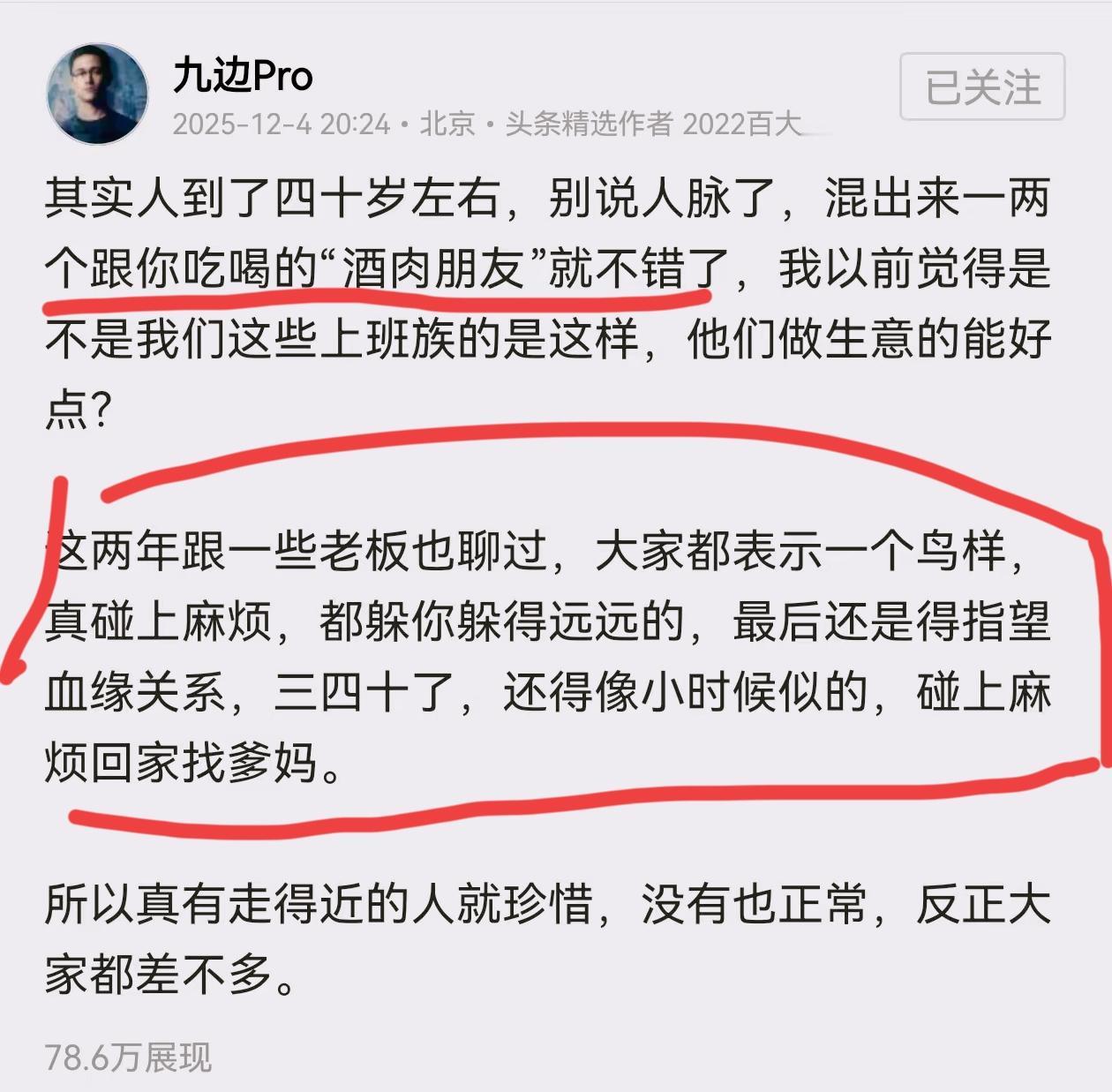九边说的在理如果当你自己不够优秀时,所谓的人情事故没多大鸟用即使是桃园三结义那种传说中的友情,本质也是两位武人帮助落魄皇族争天下的故事。你不在体制内,也不是经常跟政府打交道的商人 人到中年, 一般都经历过人生的低谷。 只有真的经历过深陷低谷,你才会看清楚年轻时 用心经营的所谓朋友,几乎都是假的,你才会深 刻体会到什么叫"形同陌路"!人到中年注定朋友会越来越少我在几年前就已经跟家里闹翻了,已经成功地从“听话的孩子”转变成“不懂事的孩子”“浑身都是刺的家伙”。 有了这些标签之后,摆脱了道德枷锁之后,我活得要多爽有多爽,最具体的表现是:我吃饭越来越香了,睡眠质量也越来越所以现在的球场我也很少去了,下班后回家看回书,泡壶茶,安安静静过日子