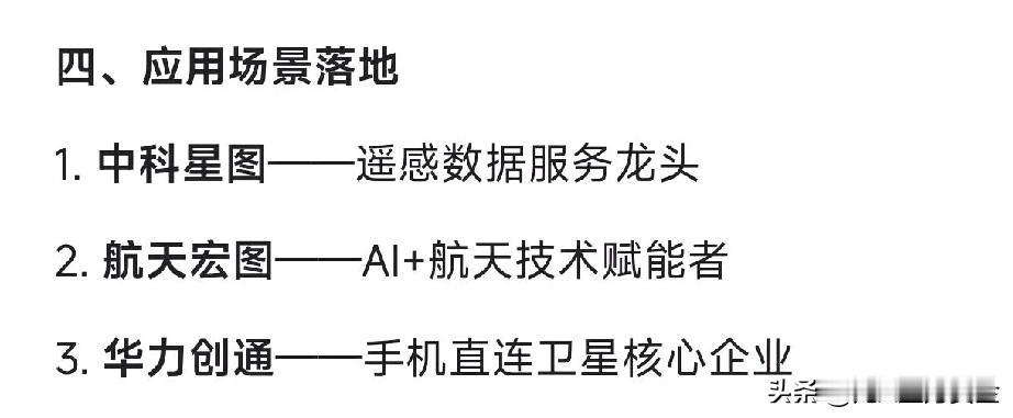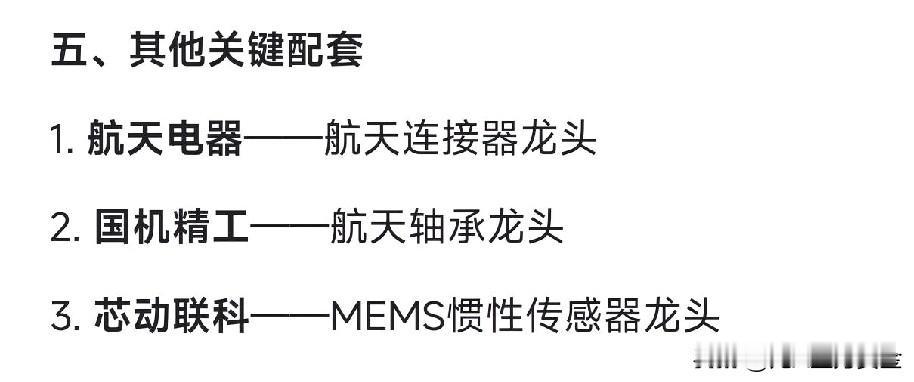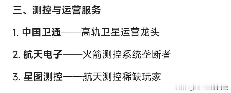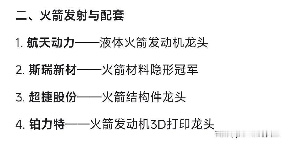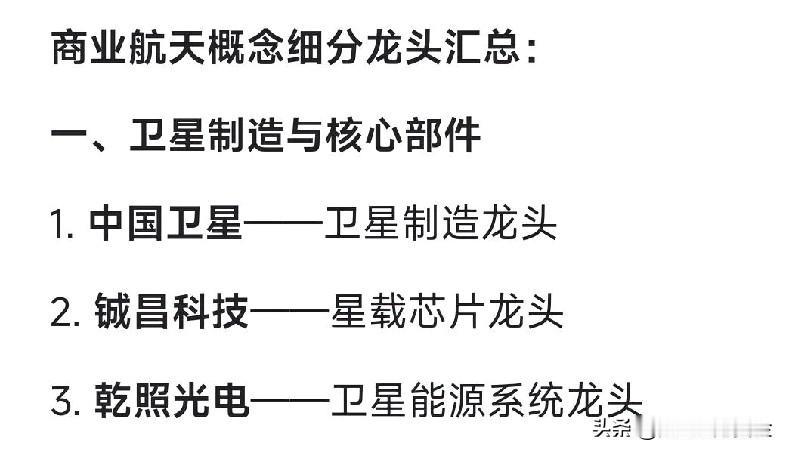 商业航天概念细分龙头汇总: 一、卫星制造与核心部件 1. 中国卫星——卫星制造龙头 2. 铖昌科技——星载芯片龙头 3. 乾照光电——卫星能源系统龙头 二、火箭发射与配套 1. 航天动力——液体火箭发动机龙头 2. 斯瑞新材——火箭材料隐形冠军 3. 超捷股份——火箭结构件龙头 4. 铂力特——火箭发动机3D打印龙头 三、测控与运营服务 1. 中国卫通——高轨卫星运营龙头 2. 航天电子——火箭测控系统垄断者 3. 星图测控——航天测控稀缺玩家 四、应用场景落地 1. 中科星图——遥感数据服务龙头 2. 航天宏图——AI+航天技术赋能者 3. 华力创通——手机直连卫星核心企业 五、其他关键配套 1. 航天电器——航天连接器龙头 2. 国机精工——航天轴承龙头 3. 芯动联科——MEMS惯性传感器龙头