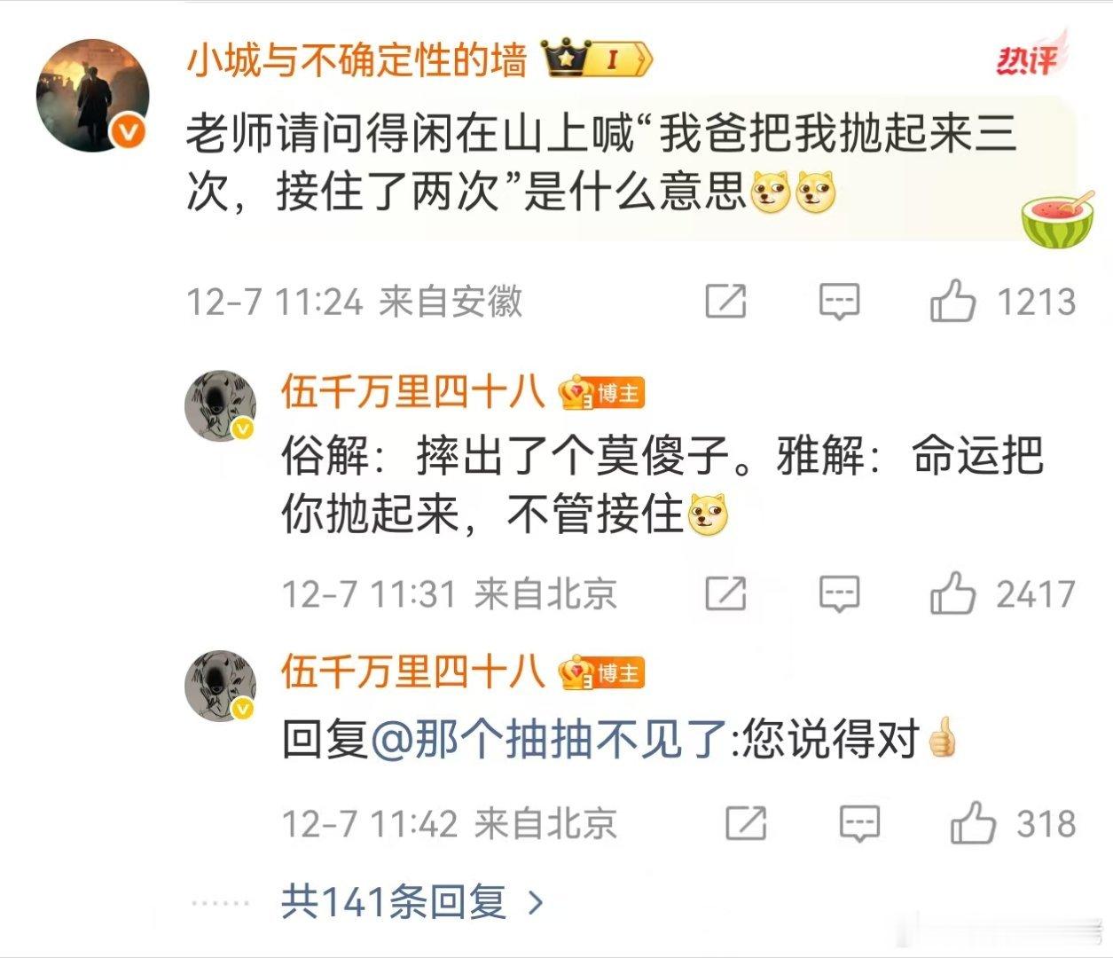 怎么解读莫得闲在山上喊出→我爸把我抛起来三次,接住了两次!这句话!编剧兰晓龙这么解读,我怎么还没看懂,我莫不是也是个傻子吧