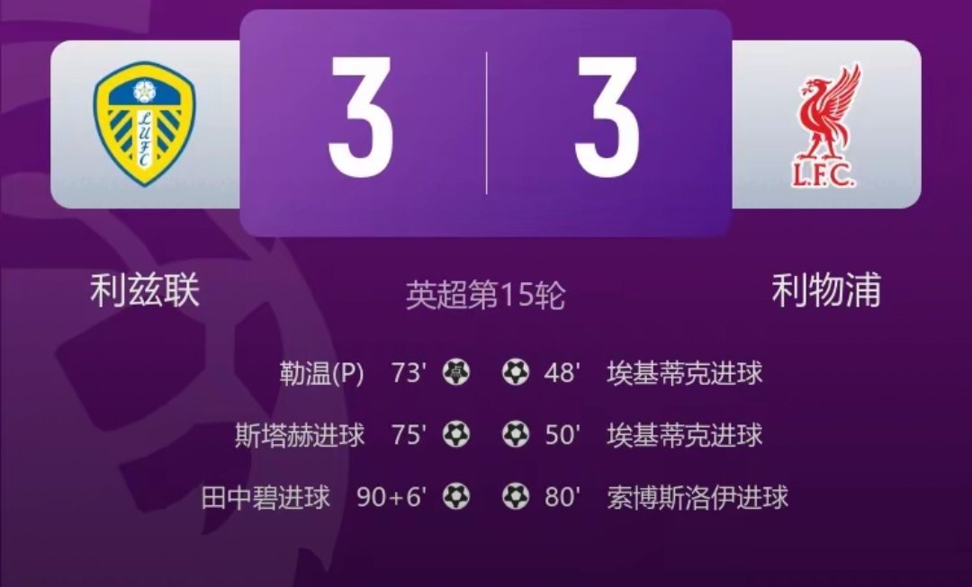 痛失好局!利物浦遭绝平3-3利兹联 埃基蒂克双响田中碧96分钟绝平利物浦利兹联 12月7日讯 北京时间12月7日凌晨1时30分,英超第15轮,利物浦做客埃兰路球场对阵利兹联。上半场双方均无建树,琼斯有一脚射门击中横梁。利物浦半场0-0战平利兹联。下半场,埃基蒂克梅开二度,科纳特送点,勒温点射,斯塔赫扳平比分,随后索博斯洛伊破门,田中碧补射阶段绝平。最终利物浦3-3战平利兹联,暂时排名积分榜第八。