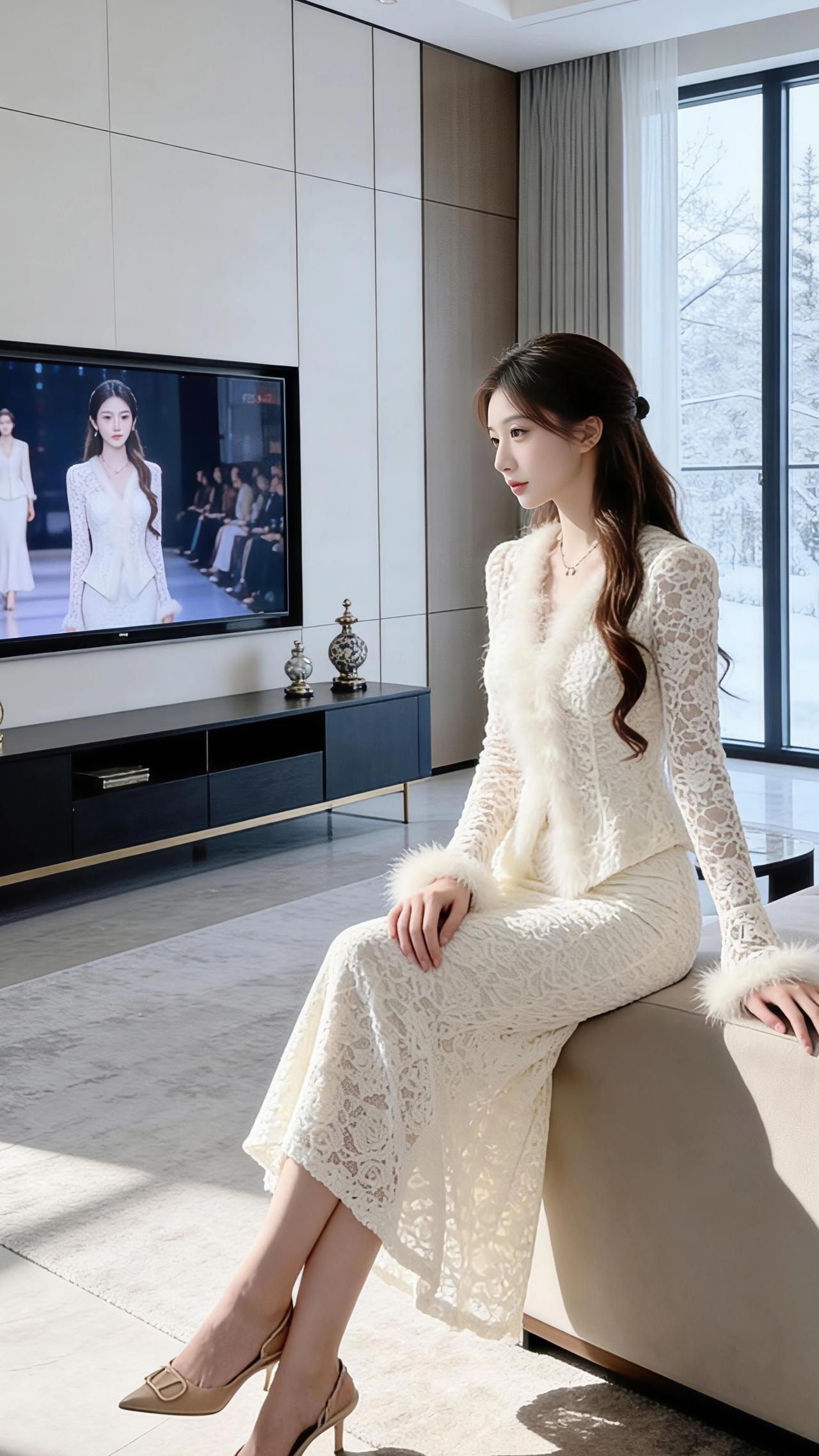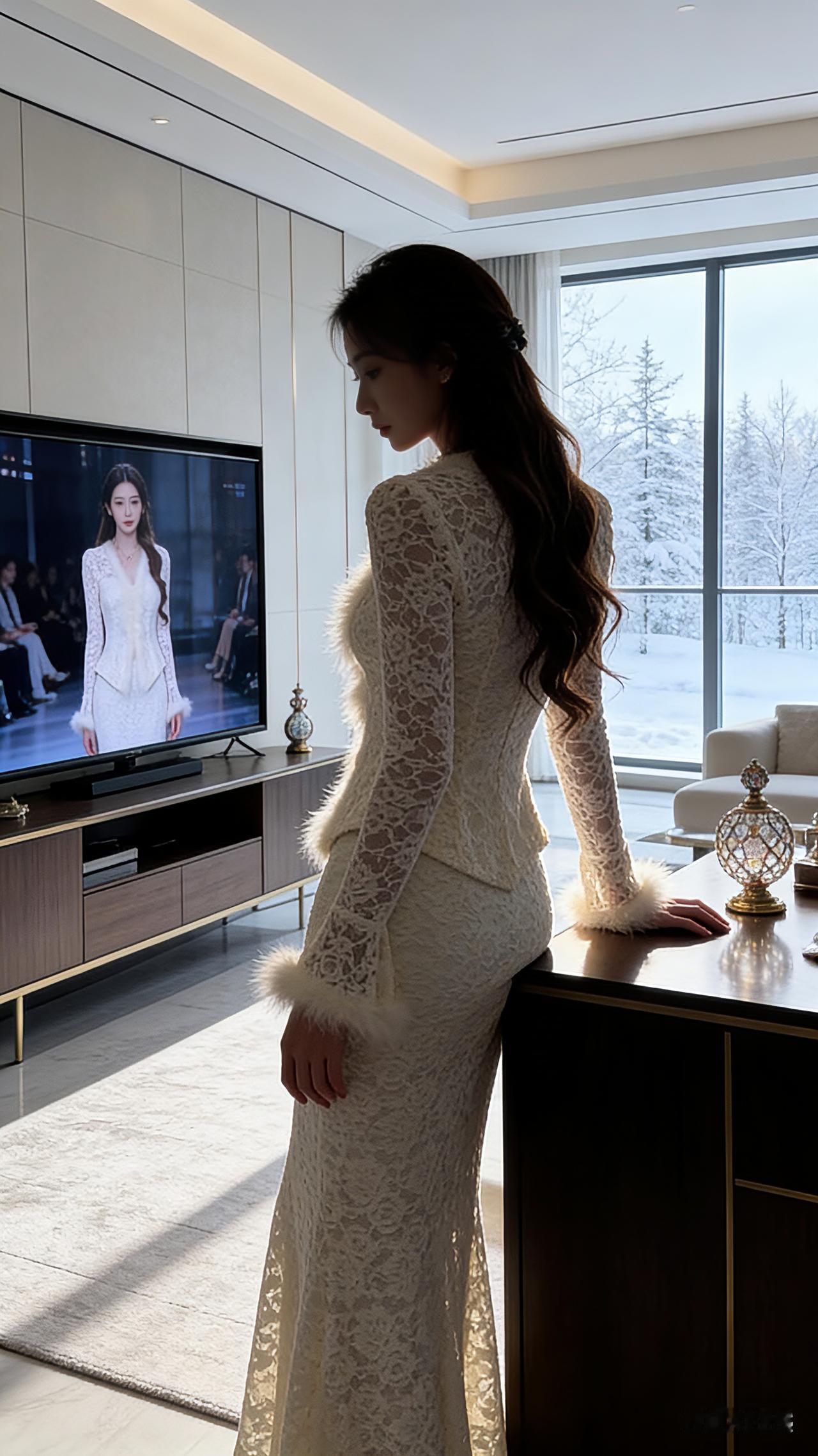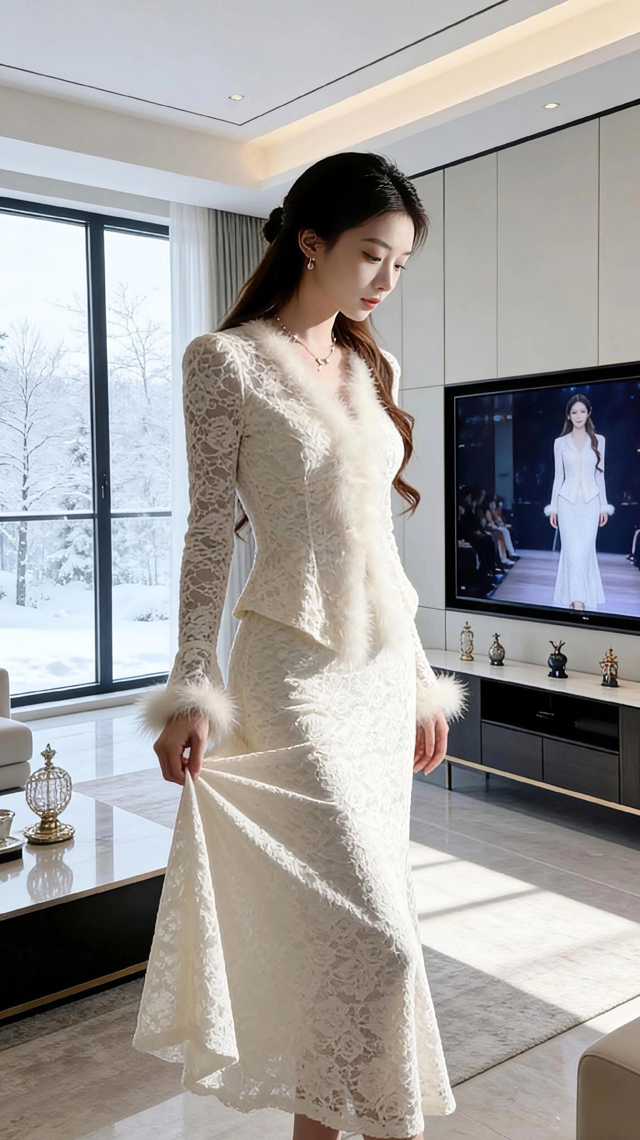 冬日的光,是裹了糖霜的,落在她肩头那圈软绒上,便融成了轻软的雾。 蕾丝是时光织就的网,缠在腕间、垂在裙裾,把窗外的雪色都滤得温柔。她倚着桌沿时,发梢的卷儿漫过肩线,像把没讲完的故事,轻轻搭在蕾丝的纹路里。 电视屏里映着另一个自己,步履带起裙摆的弧,像雪枝上颤落的星。而此刻她指尖碰着裙角,蕾丝的凉与绒毛的暖,在光里织成半阙诗——是冬的静,也是裙裾里藏着的、未说尽的软。 高级感穿搭 轻奢女装 优雅气质 高端大气