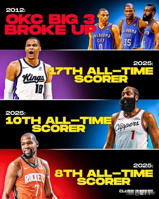 雷霆三少,一周之内全都迎来了得分里程碑! 大哥杜兰特——职业生涯得分突破31000分,成为NBA历史上第8位得分破31000的球员! 二哥威少——职业生涯总得分26514分,超越邓肯排名历史第17位! 三弟哈登——职业生涯总得分为28303,超越安东尼排名历史第十。 哈登即将超越奥尼尔排名历史第九,排在杜兰特后面,三弟反超了二哥威少,紧跟着大哥杜兰特。 哈登距离3万分还差1697分,本赛季哈登场均可以拿到26.8分,还需要63场比赛突破3万分。 威少距离3万分还差3486分,本赛季威少场均可以拿到13.4分,还需要261场比赛突破3万分,至少还需要打4个赛季。