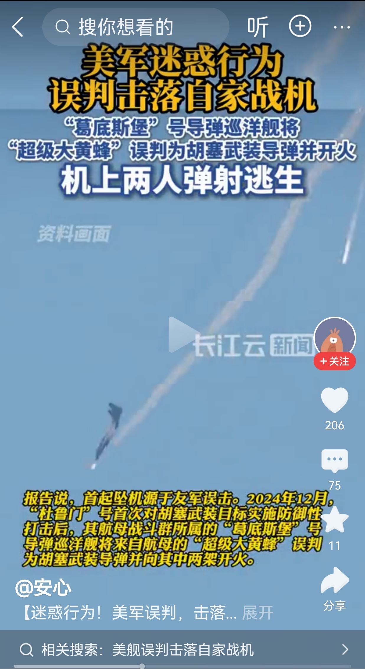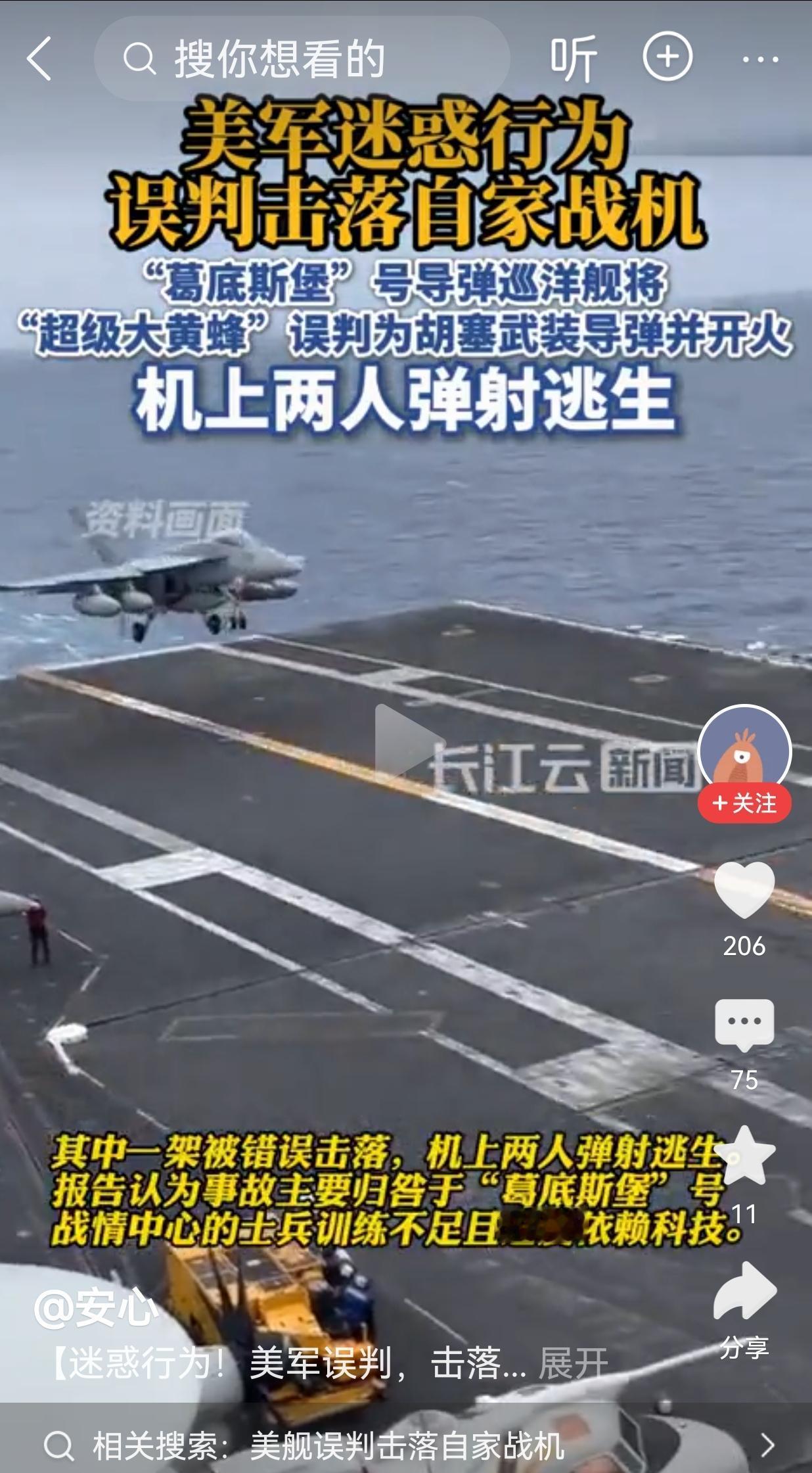 看看美国的“葛底斯堡”号导弹巡洋舰有多牛! 美国海军12月4日披露:2024年12月,“杜鲁门”号航母在执行对胡赛武装目标实施防御性打击后,葛底斯堡巡洋舰居然将来自航母的“超级大黄蜂”误判为胡塞武装导弹,并向其中两架开火。其中一架被击落,机上两人弹射逃生。我就问你,你服不服?