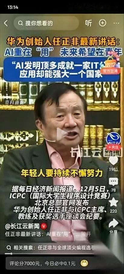 最服任正非!面对刁难 普林斯顿学生提棘手问题 任正非咋回?直接预判算力过剩!12月5日ICPC座谈上,当被问“计算资源受限如何克服”,他直言“算力过剩时代必来,建数百个大模型是正确探索”。这回答够霸气!没顺着“资源不足”的陷阱走,反而用前瞻性眼光撕开新维度——中国企业从不是被动等资源,而是主动创造趋势。当西方还在纠结“有没有”,我们已在思考“怎么用”,这种跳出框架的破局思维,才是华为能扛住重压的底层逻辑。你觉得任正非这预判够不够犀利?