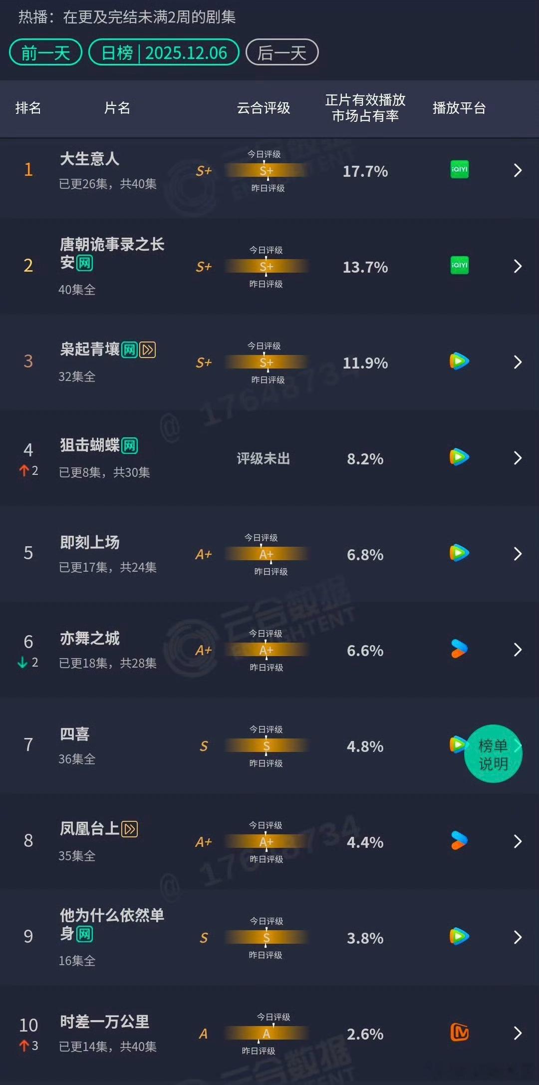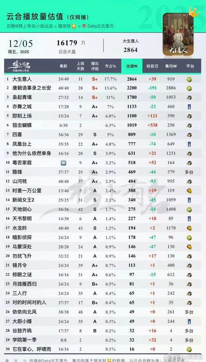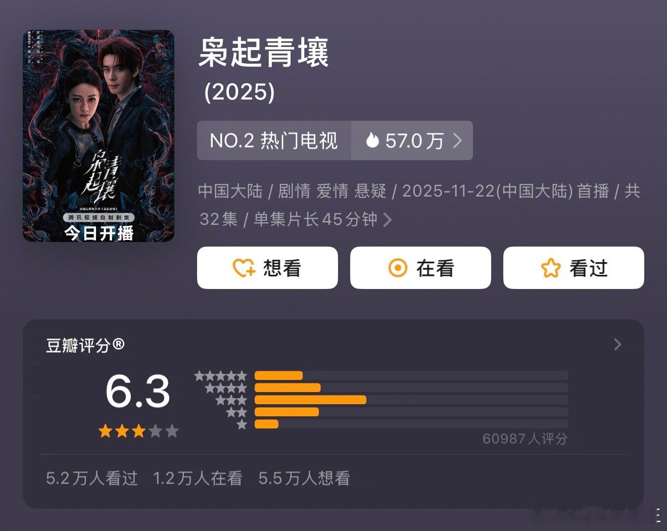 迪丽热巴《枭起青壤》正式播完了,从各个维度,来看看这部剧的播出成绩单,纯数据微博。1、豆瓣评分:6.3分,打分人数6w,3⭐占比最多。2、站内最高热度27289。3、云合单日最高热度排名第二,单日最高热度2250w,截止目前集均1000w左右。4、广告方面:开局6广告,萝卜🥕两集。客观说,这种成绩如何?