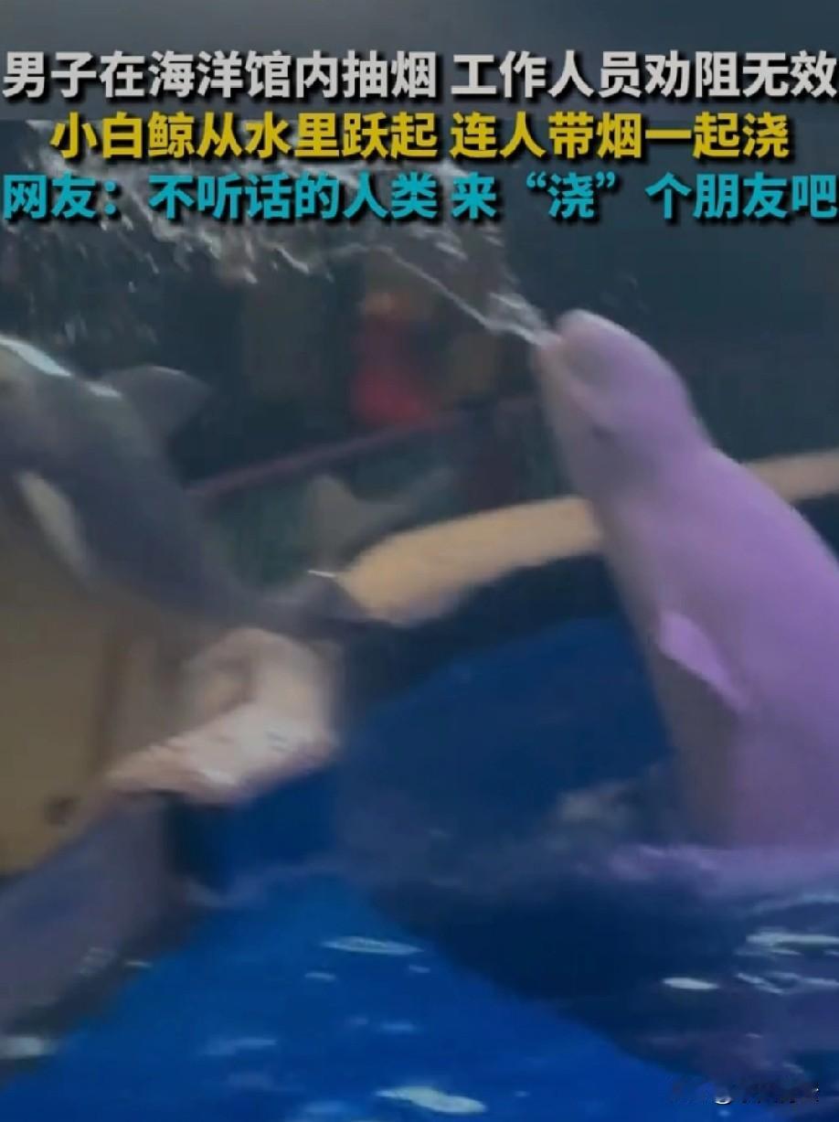 近日大连海洋馆惊现名场面:一名男子无视规定在馆内抽烟,任凭工作人员怎么说都拒不配合,态度特别蛮横。 没想到馆里的白鲸看不下去了,悄悄从背后喷了他一身水,把男子浇得浑身湿透,直接拿捏住了没素质的人! 真的太刷新认知了,原来白鲸不仅可爱智商还这么高,比某些不守规矩的人强太多了! 公共场合讲文明是基本底线,偏偏有人就是无视规则,连海洋馆的白鲸都忍不住“出手”了,必须给大白安排豪华加餐! 弱弱问一句:目睹白鲸这波神操作,现场游客是不是都笑出了声? 男子抽烟 白鲸跃起连人带烟一起浇