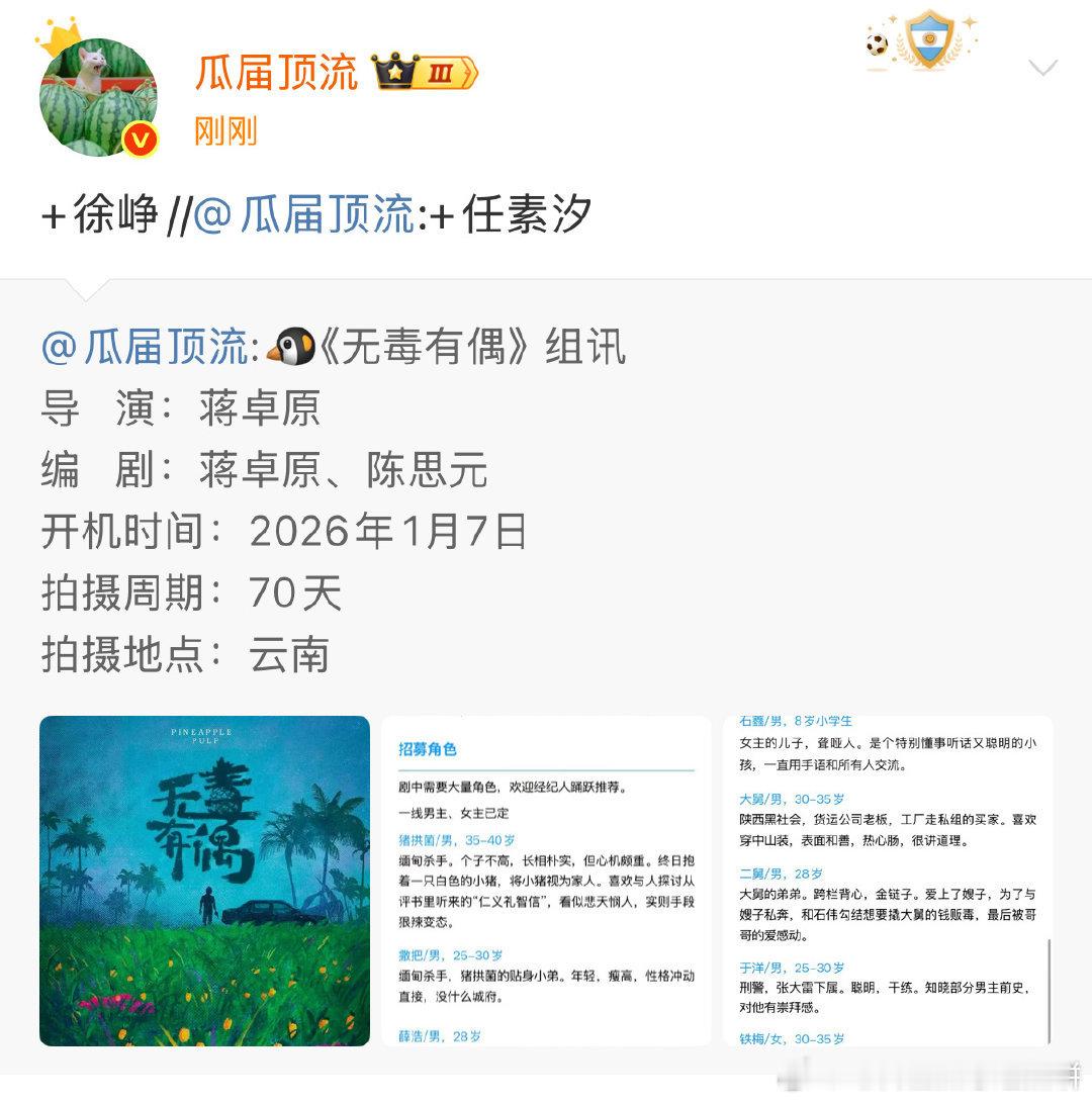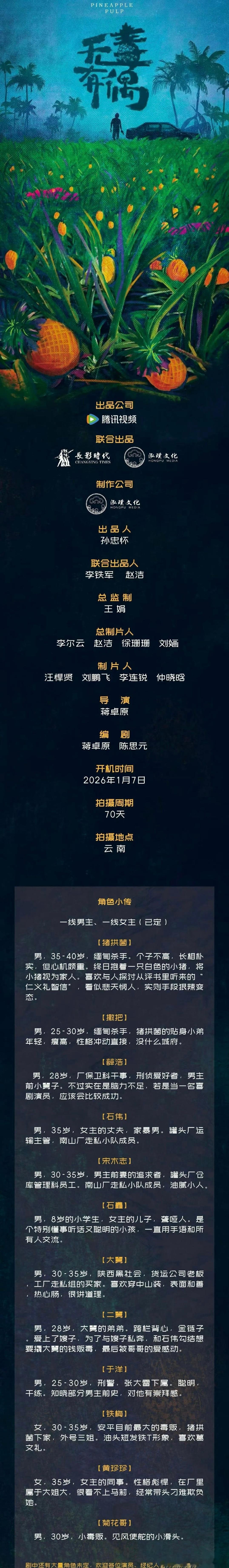 嚯这个故事看起来设定挺有意思,阵容也可以🐧悬疑剧《无毒有偶》男女主:徐峥、任素汐导演:蒋卓原《消失的十一层》1月7日云南开机,拍摄周期70天。项目简介:一个卖菠萝的前刑警、一个失手杀夫的女工,两具交换的尸体、两组错位的罪犯,命运的漩涡将边陲小镇的众人席卷其中,共同上演了一出荒诞罪案浮世绘。
