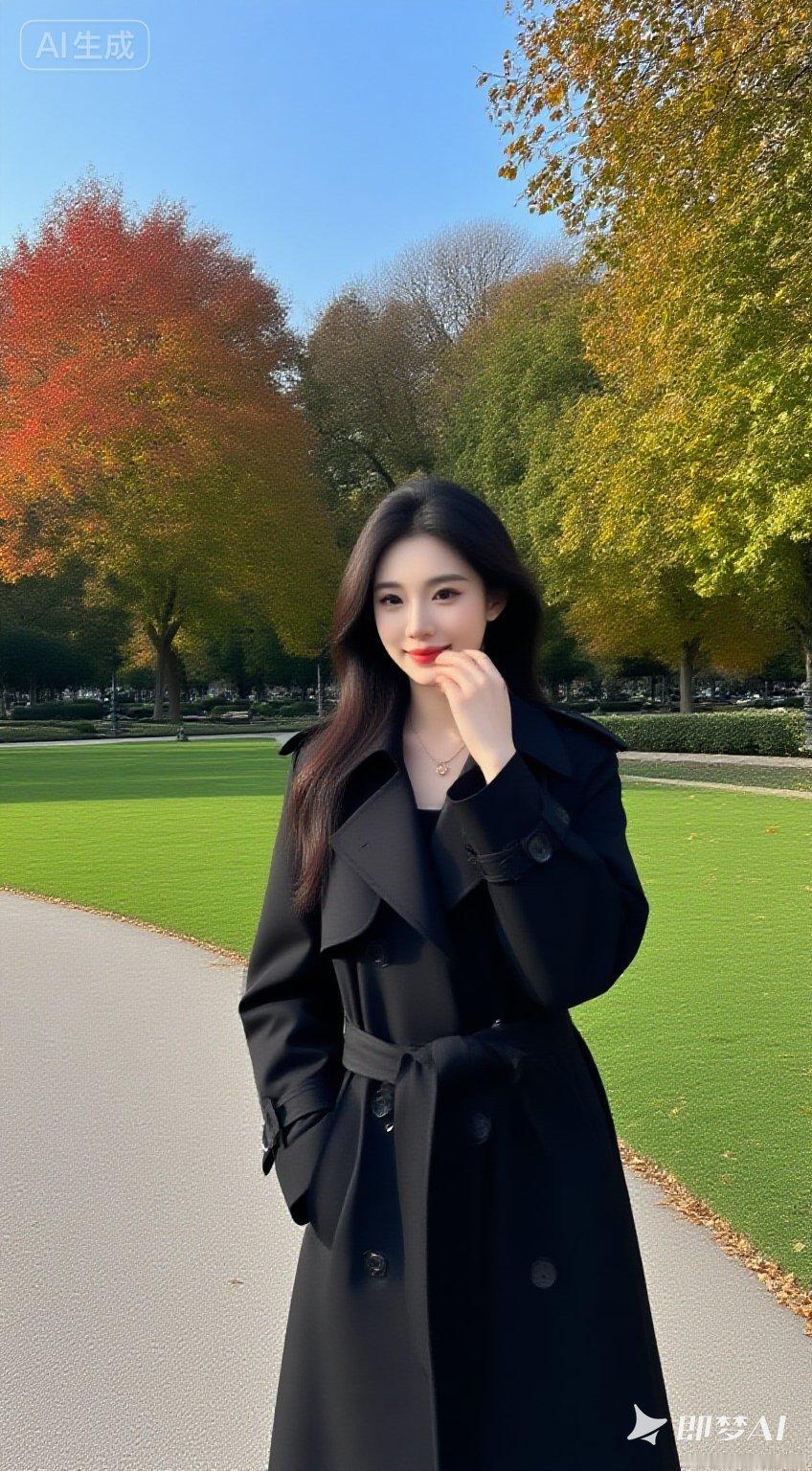 淡红唇亮眼,眼妆清透,长发乌黑披肩;绝世容颜。身着白色毛绒外套,内搭黑色衣物,颈