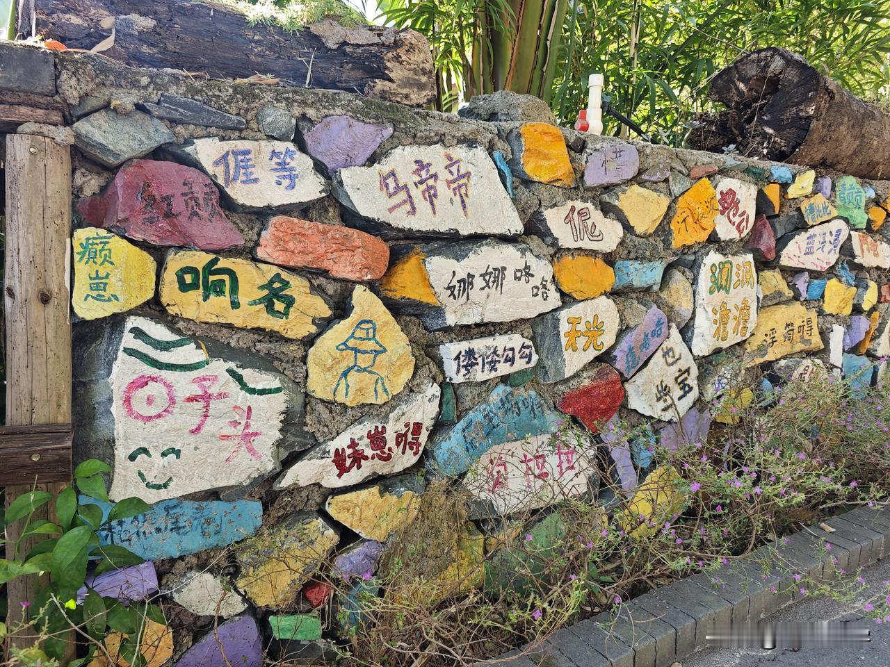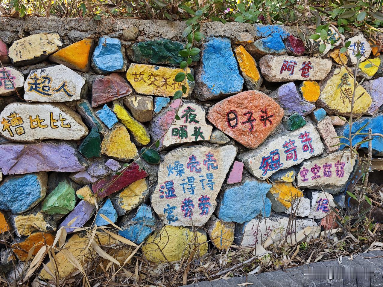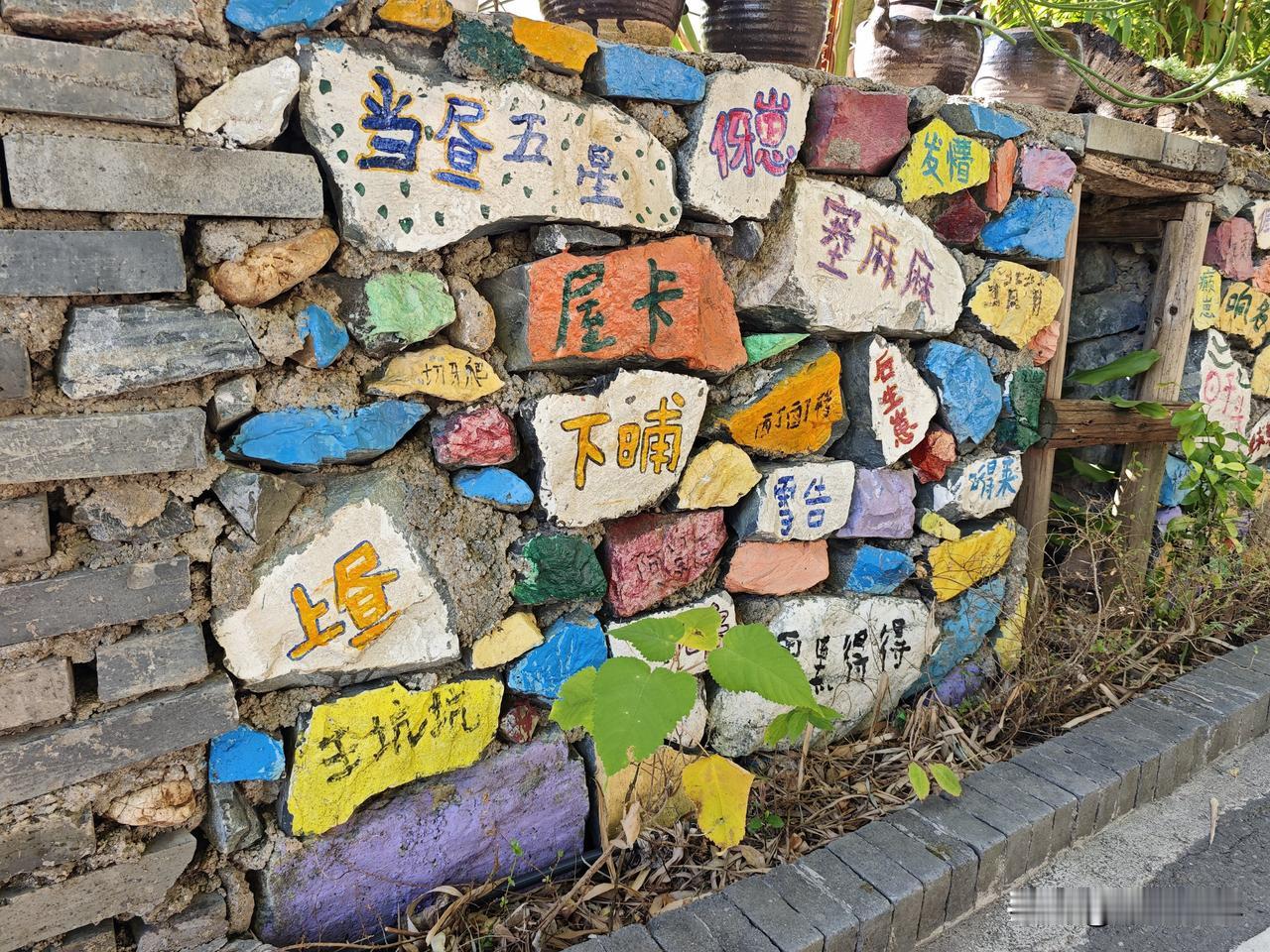 在黄花湾的一处停车场附近,有这么一条写满了客家方言的围墙,在每一块石板上面,艺术家们都用彩色的画笔朴素的写下了龙南方言。比如,“四四六六”就是形容傻白甜的意思;“也些宝”呢?也是形容不聪明的样子;“上昼”就是上午的意思;“超人”就是骗人的意思……还有很多当地方言非常有意思,小时候只是用嘴巴说,如今长大了看到用汉字写下来后,又是另外一种心境。客家方言字 亦口顺口溜 客家人四句 龙南墙面 广西匠之心标识 客家方言岛 龙南老石板 五里黄屋
