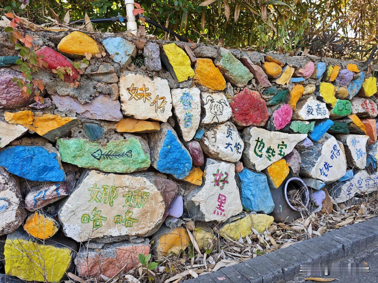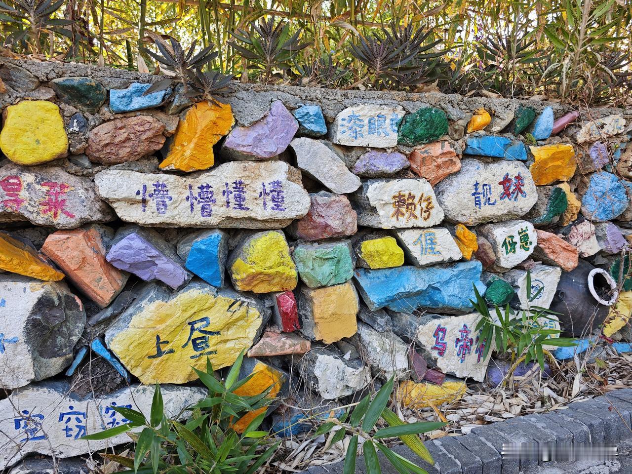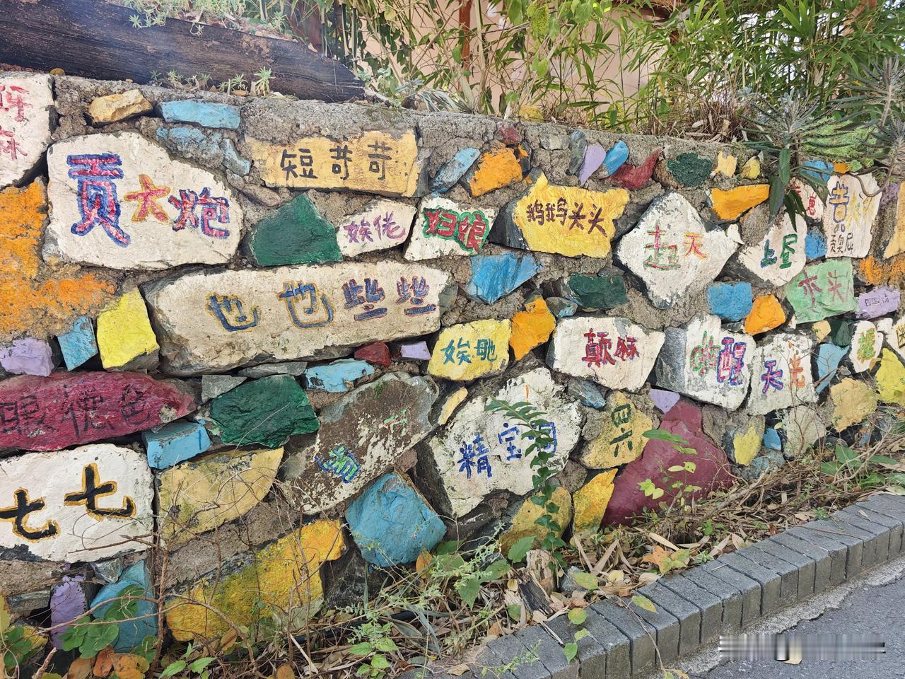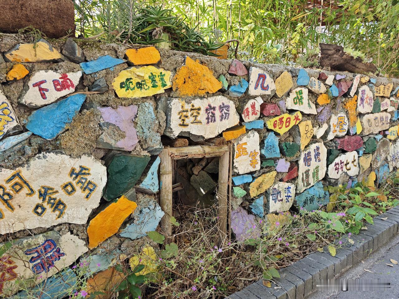 在黄花湾的一处停车场附近,有这么一条写满了客家方言的围墙,在每一块石板上面,艺术家们都用彩色的画笔朴素的写下了龙南方言。比如,“四四六六”就是形容傻白甜的意思;“也些宝”呢?也是形容不聪明的样子;“上昼”就是上午的意思;“超人”就是骗人的意思……还有很多当地方言非常有意思,小时候只是用嘴巴说,如今长大了看到用汉字写下来后,又是另外一种心境。客家方言字 亦口顺口溜 客家人四句 龙南墙面 广西匠之心标识 客家方言岛 龙南老石板 五里黄屋