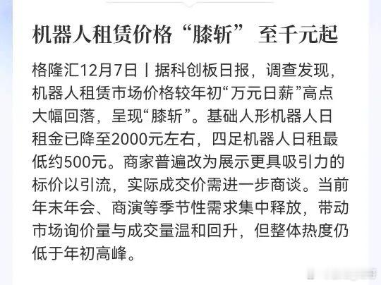 机器人租金这回真是跳水价了!年初还喊日薪过万,现在一两千就能租一天,跟打折促销似的。商家也学乖了,先标个低价把你吸引过来,具体多少钱再慢慢谈!赶上年末企业搞年会、商场做活动,租机器人的稍微多了点,但想回到年初那种火爆,还是差得远哦!要我说,这价格膝斩不算坏事。说明市场冷静下来了,虚火退了,让真正需要机器人的人用得起。长远看,租金实在点,机器人才能更快走进工厂、商场,变成咱们日常的一部分!不过商家也得想想,光拼价格不行,服务跟得上,用得顺手了,这门生意自然能做得长久!