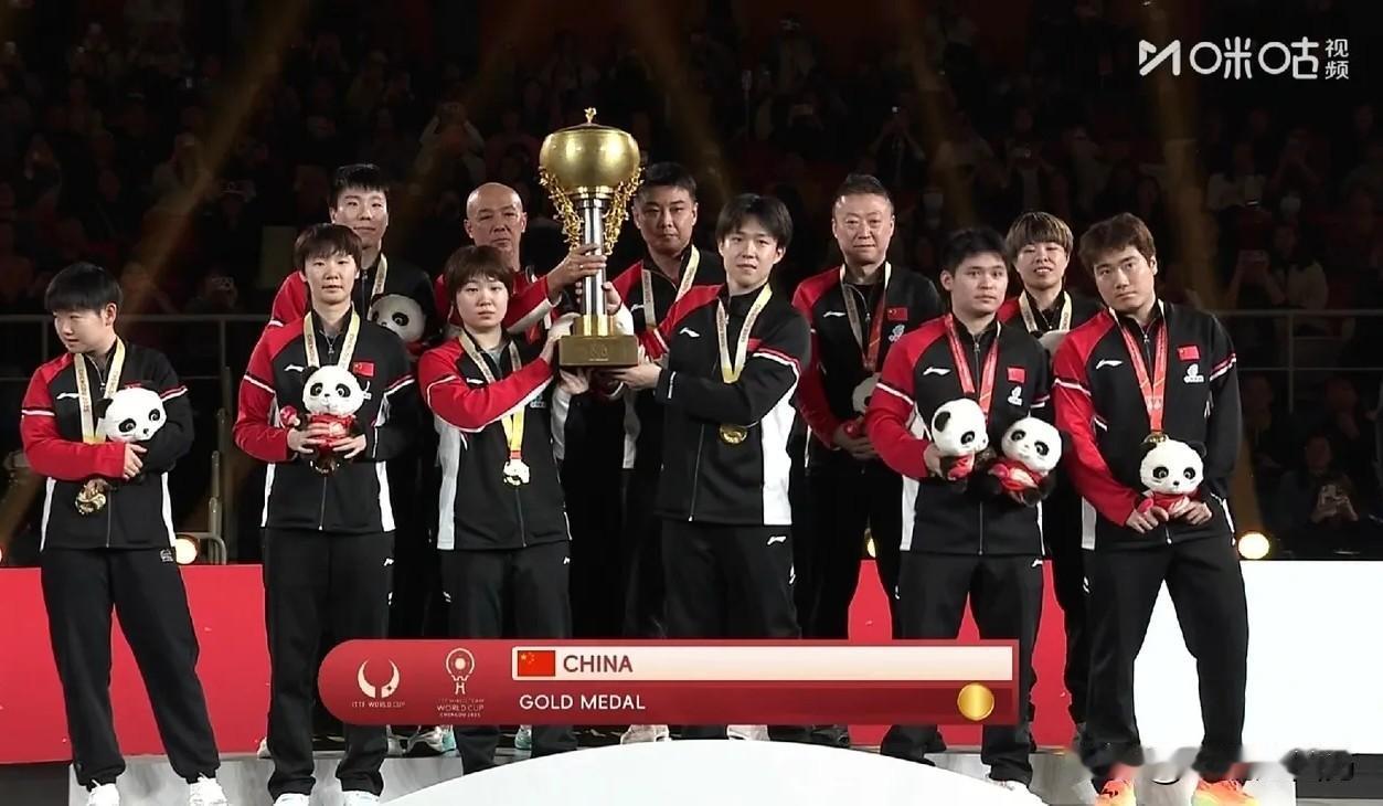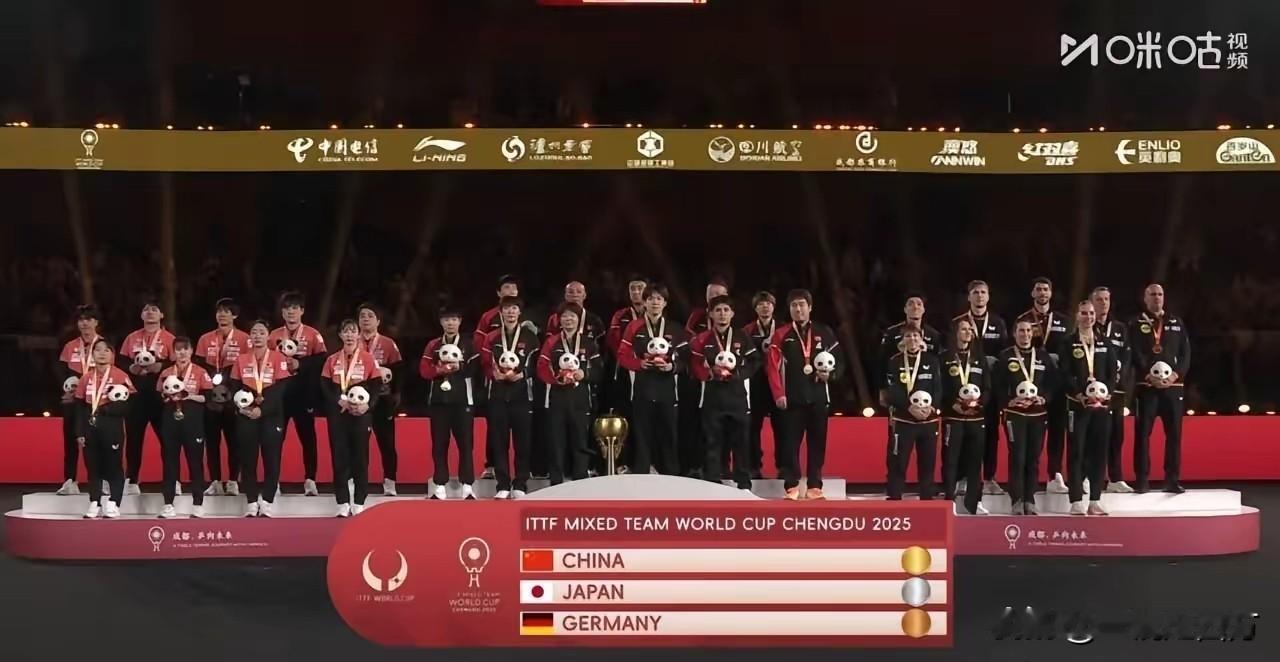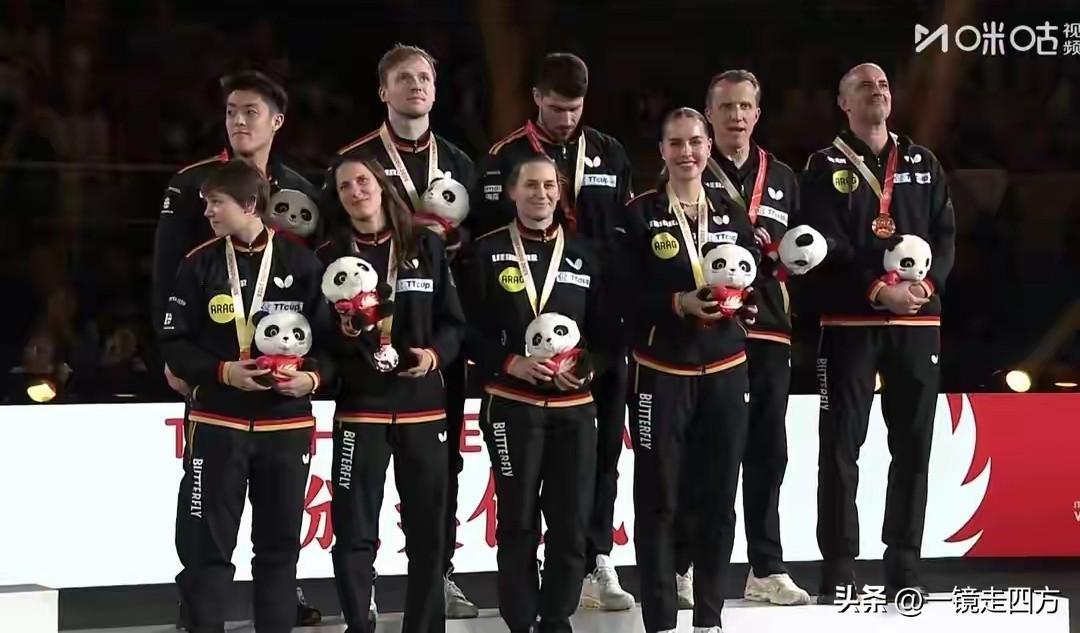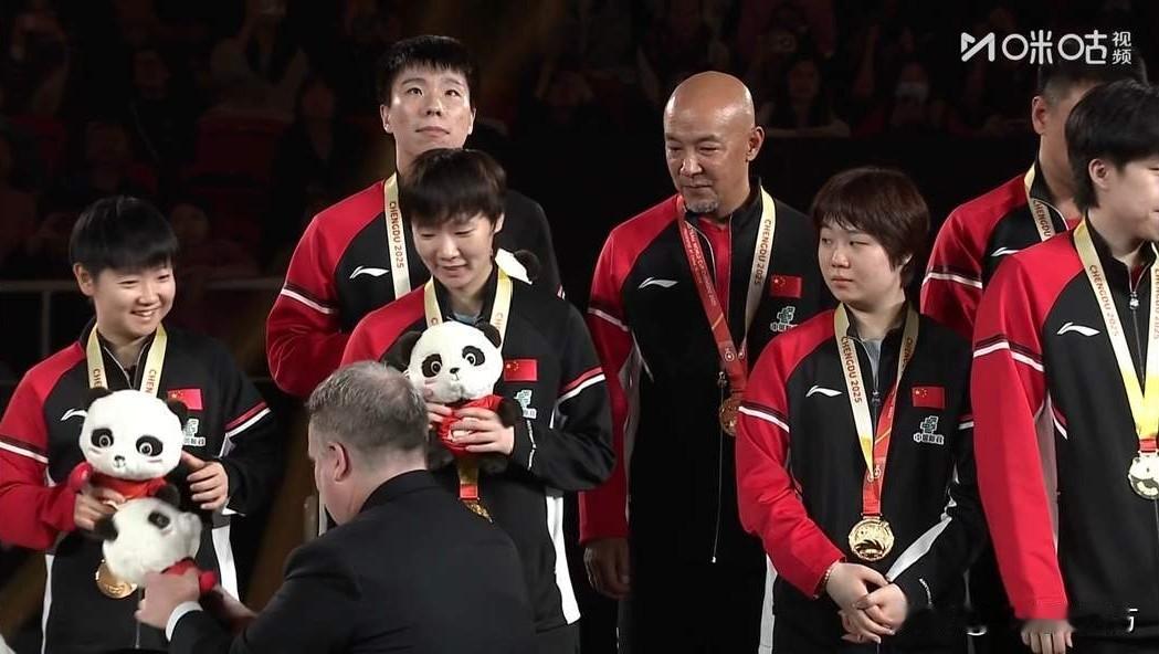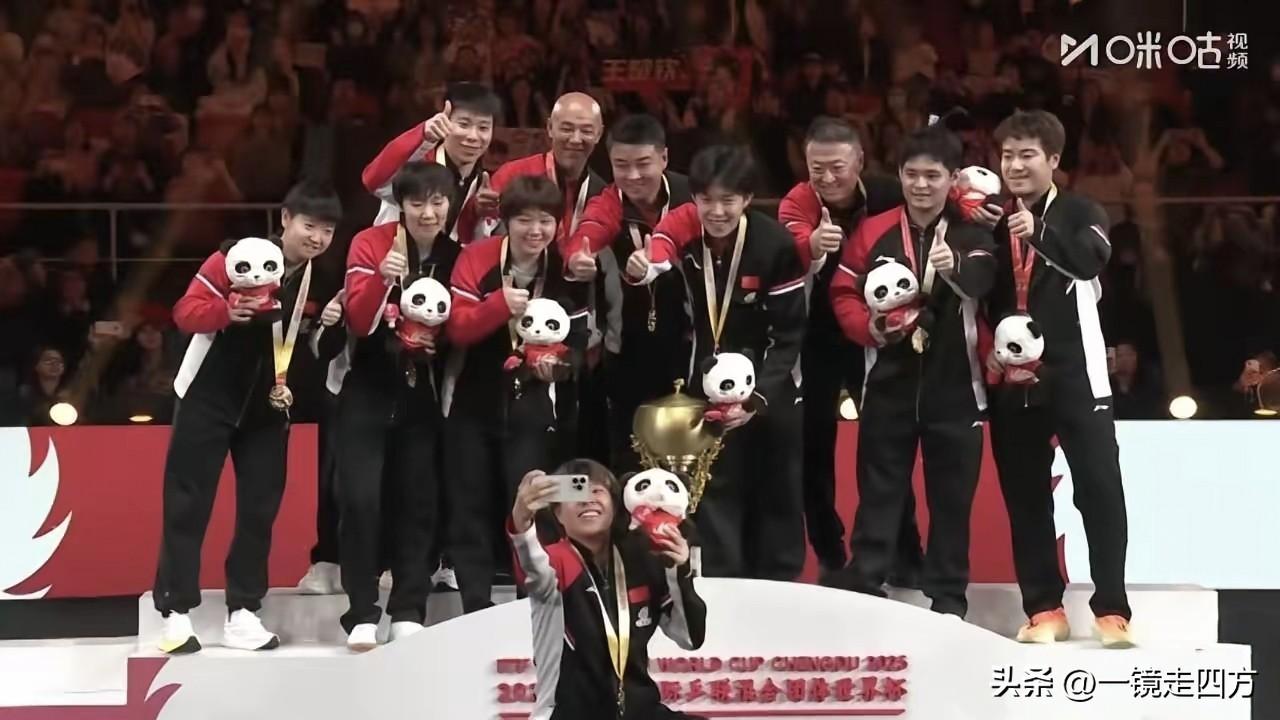 中国乒乓球队在刚刚结束的混合团体世界杯决赛8-1大胜日本队,成功拿下三连个,只上了一场没有得分的徐瑛彬也随队成为了世界冠军,日本队收获亚军,德国队获得第三名,首次登上该项赛事领奖台。颁奖仪式上,可能是“领教”过奖杯的重量,孙颖莎站在最边上,王楚钦和蒯蔓站在中间举起奖杯,刘国梁、王励勤、刘诗雯都作为颁奖嘉宾现身颁奖典礼,大合影的时候,憨厚的大迪站在最前面“执镜”。