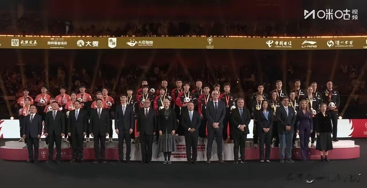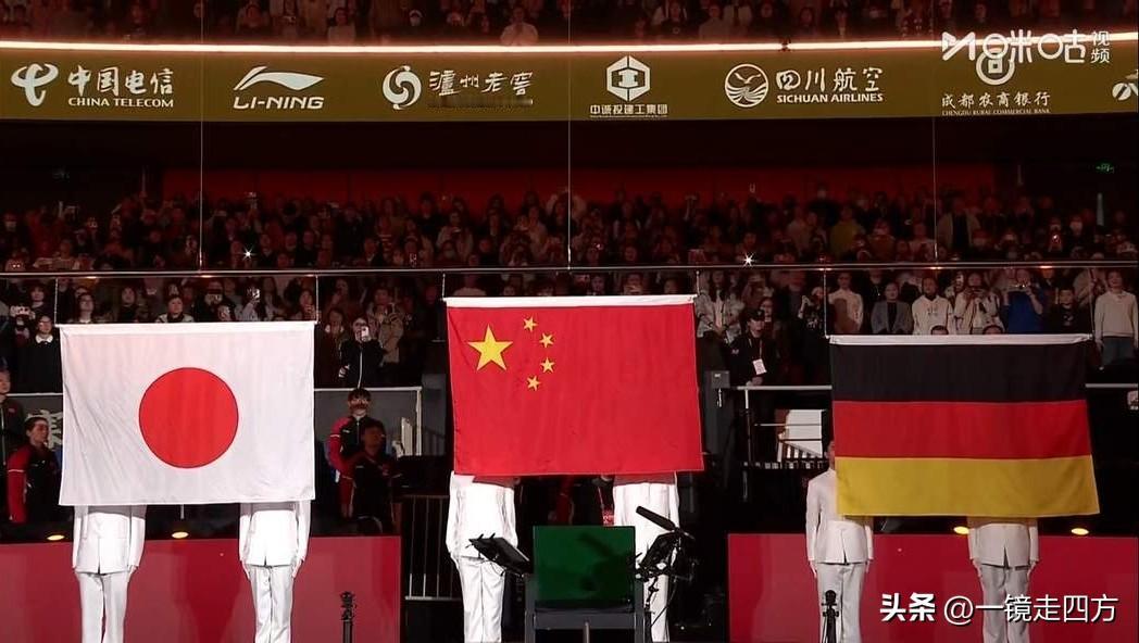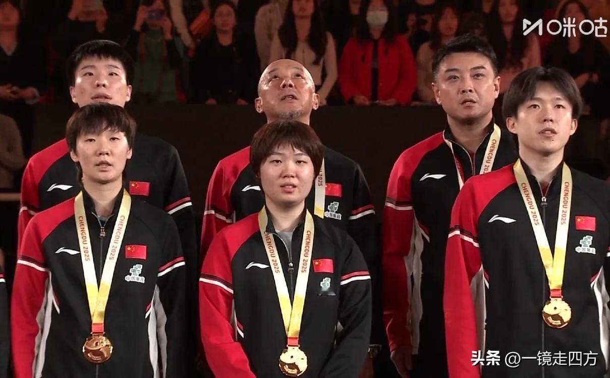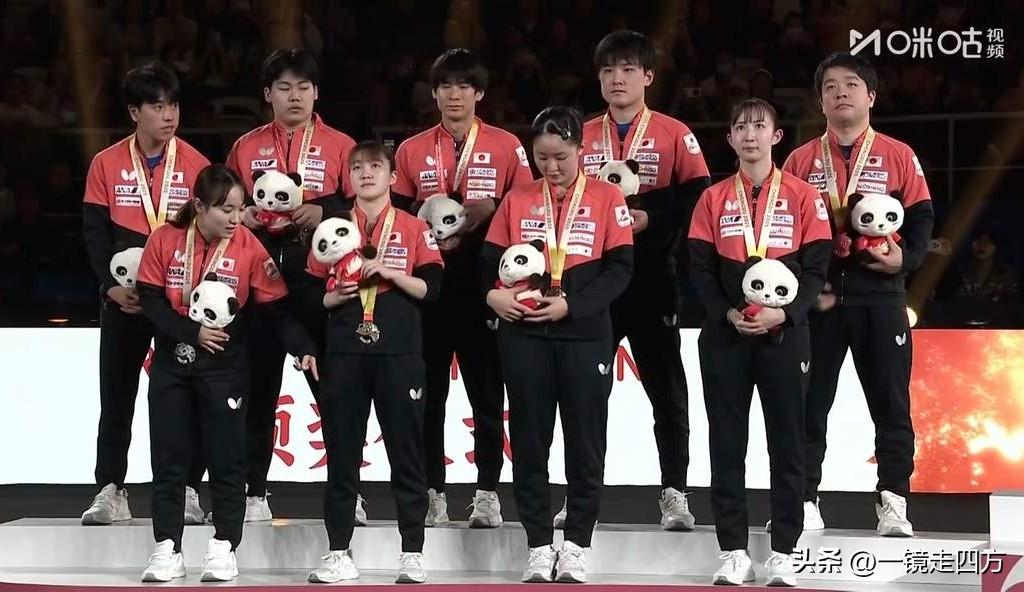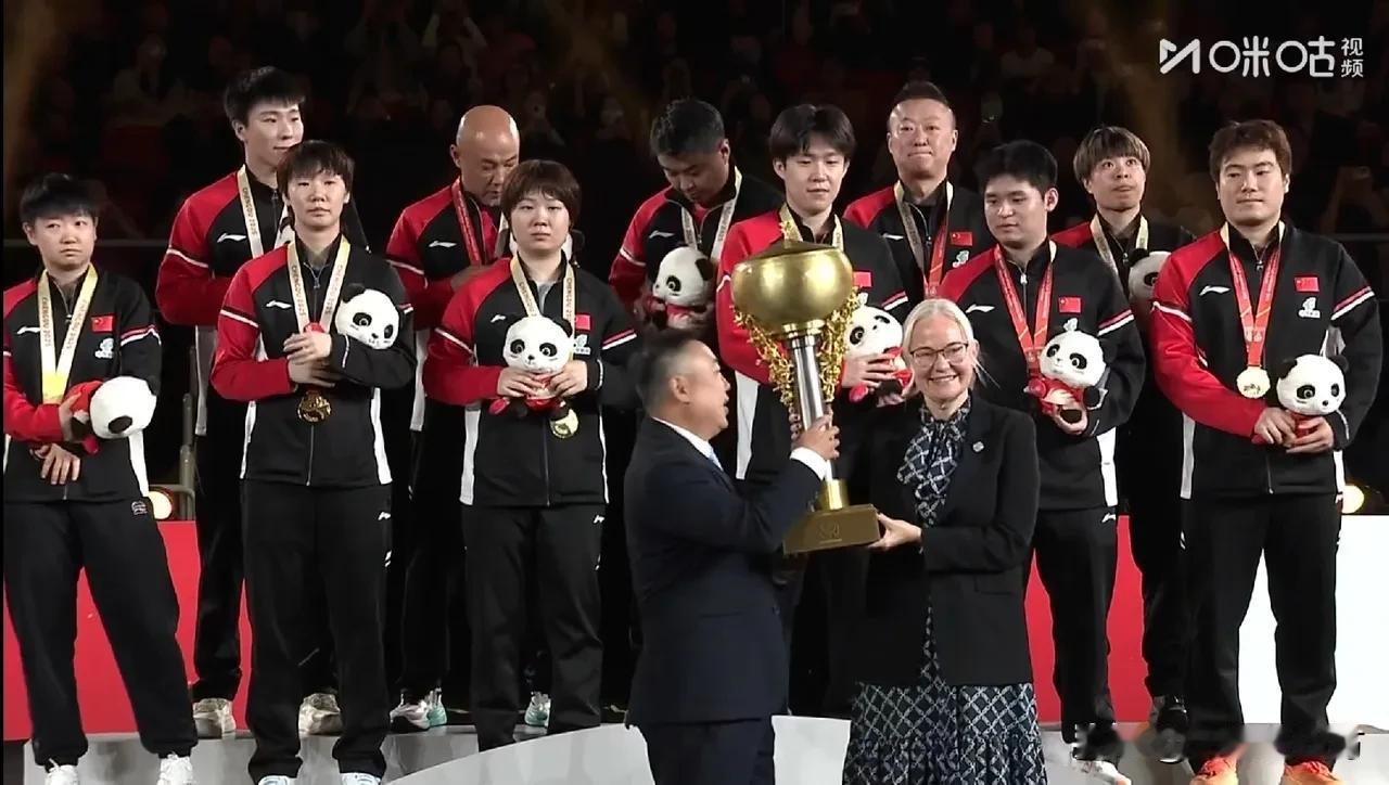 中国乒乓球队在刚刚结束的混合团体世界杯决赛8-1大胜日本队,成功拿下三连个,只上了一场没有得分的徐瑛彬也随队成为了世界冠军,日本队收获亚军,德国队获得第三名,首次登上该项赛事领奖台。颁奖仪式上,可能是“领教”过奖杯的重量,孙颖莎站在最边上,王楚钦和蒯蔓站在中间举起奖杯,刘国梁、王励勤、刘诗雯都作为颁奖嘉宾现身颁奖典礼,大合影的时候,憨厚的大迪站在最前面“执镜”。