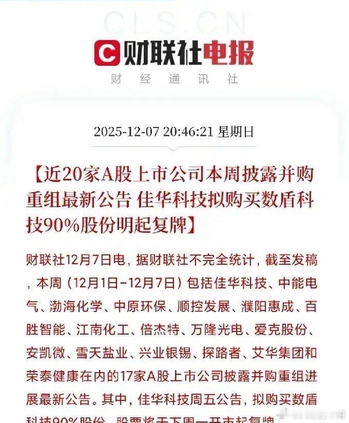A股并购重组,17家公司这周集体行动!藏着跨年妖股?1. 佳华科技:拟购买数盾科技90%的股份,聚焦数据安全领域,下周一复牌。2. 中能电气:拟收购三家电气公司股权,加码电网设备主业。3. 百胜智能:拟收购中科深谷51%股权,旨在开发机器人产品,向智能装备拓展。4. 雪天盐业:跨界收购美特新材股权,布局上游新材料领域。5. 探路者:拟收购上海通途半导体51%股权,标的从事芯片设计,公司从户外用品,向高科技探索。6. 渤海化学:筹划出售石化资产,并购新材料公司控制权,可能进行业务转型。7. 中原环保:拟收购郑州市再生水管线资产,扩大水务基础设施运营规模。8. 顺控发展:拟收购环保投资公司,拓展环保业务领域。9. 濮阳惠成:拟收购雷佰瑞部分股权,属于财务或战略投资。10. 江南化工:拟收购庆华民爆100%股份,属于民爆行业内的整合。11. 倍杰特:全资子公司拟收购有色金属公司控股权,向资源领域延伸。12. 万隆光电:筹划购买工业自动化公司控制权,可能向智能制造转型。13. 爱克股份:拟收购东莞硅翔100%股权,标的为新能源汽车零部件供应商,公司跨界进入新能源赛道。14. 安凯微:拟收购物联网芯片设计公司,强化在物联网领域的核心技术。15. 兴业银锡:子公司拟收购同行业上市公司股权,属于产业资本的战略投资。16. 艾华集团:拟收购关联公司股权,可能涉及内部业务整合。17. 荣泰健康:拟收购健康科技公司股权,并取得控制权,旨在丰富个人健康护理产品线。