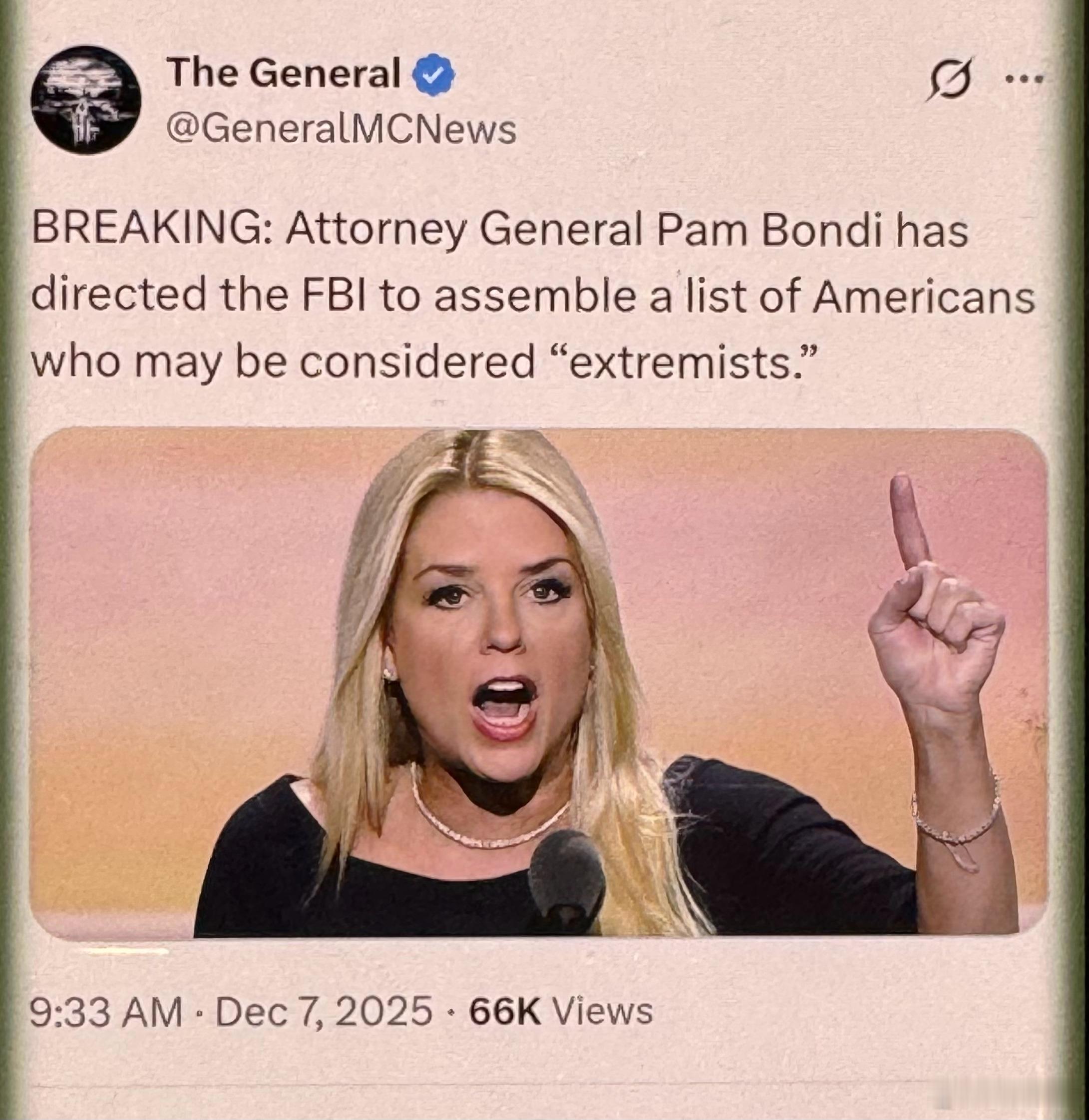 突发!大清洗开始!美国司法部长帕姆·邦迪指示联邦调查局收集一份可能被视为“极端分子”的美国人名单。