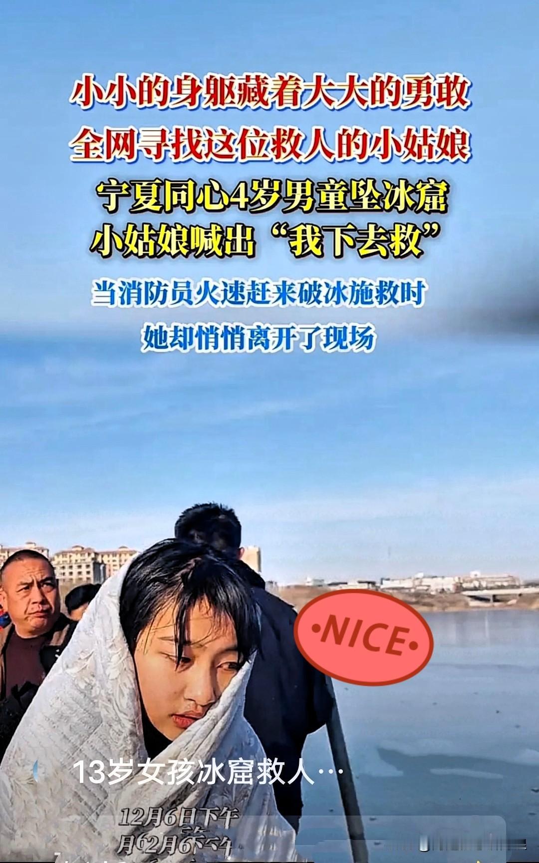 全网心疼到破防!13岁姑娘冰窟救男童后默默离场,撒谎理由让父母泪崩! 最近宁夏吴忠的13岁女孩李佳婷,用一场果断的见义勇为暖哭了无数人!这个刚上初一的小姑娘,用稚嫩的肩膀扛起了生命的重量,懂事得让人心疼又敬佩! 12月6日下午,同心县豫海湖的冰面上突发险情:一名4岁男童在玩耍时不慎踩碎薄冰,瞬间坠入冰冷的湖水中。 孩子在水里拼命挣扎,岸边围观的市民急得团团转,却没人敢贸然上前——冰面脆弱,稍不注意就可能连带落水。 就在这危急时刻,路过的李佳婷看到了这一幕。没有丝毫犹豫,没有半句询问,这个13岁的女孩立刻冲了过去。她接过市民递来的管子,小心翼翼地爬向冰窟,把管子牢牢递到男童手中。 可就在这时,脚下的冰面突然塌陷,李佳婷也掉进了刺骨的湖水里! 冰水瞬间浸透了衣服,寒冷刺骨,但她死死攥着管子不肯松手,始终保持着让男童能抓住的姿势。岸边的大人赶紧合力将李佳婷拉上岸,随后赶到的消防员顺着管子,成功将被困男童救了出来。 脱险后,李佳婷没有和消防员、救援人员多说一句话,默默骑上自行车回了家。面对父亲疑惑“衣服怎么全湿了”的追问,她怕父母担心,撒谎说“是被洒水车浇湿的”。 直到当晚,家人刷到救人的视频,看到视频里那个勇敢的身影,才知道女儿经历了怎样惊心动魄的一幕。 被救男童的家长上门致谢,送来酬金被婉拒后,特意留下了水果和羊羔表达心意。学校也计划在12月8日升国旗时隆重表彰李佳婷,并为她申报见义勇为荣誉称号。 网友们纷纷点赞:“这才是新时代的好少年!13岁的年纪,却有超越年龄的勇敢和担当”“怕父母担心的谎言太好哭了,懂事得让人心疼”“平凡的孩子做出不平凡的事,这就是最动人的正能量”! 见义勇为不是成年人的专属,李佳婷用行动告诉我们,勇敢不分年龄,善良无关大小。这个默默救人、悄悄离场的小姑娘,值得所有的掌声和敬意,愿她永远被温柔以待,也愿这份善良能温暖更多人! 13岁的李佳婷也太让人破防了!小小年纪面对冰窟险情,没有半分退缩,哪怕自己掉进去都死死护住男童,这份勇敢真的远超年龄。更戳人的是她回家后撒谎的样子,明明经历了生死考验,却怕父母担心说被洒水车浇湿,懂事得让人心疼又敬佩。 现在太多人遇到事会犹豫,可这个小姑娘用本能的善良和果断,给我们上了最好的一课。善良从不是口号,勇敢也不分大小,为这个新时代好少年点爆赞!希望她的善举能感染更多人,也愿每个勇敢善良的孩子,都能被世界好好呵护! 各位读者友友们,13岁女孩冰窟救人默默离开,懂事隐瞒真相,善良勇敢得让人心疼!我们大家一起为这女孩的见义勇为点赞!