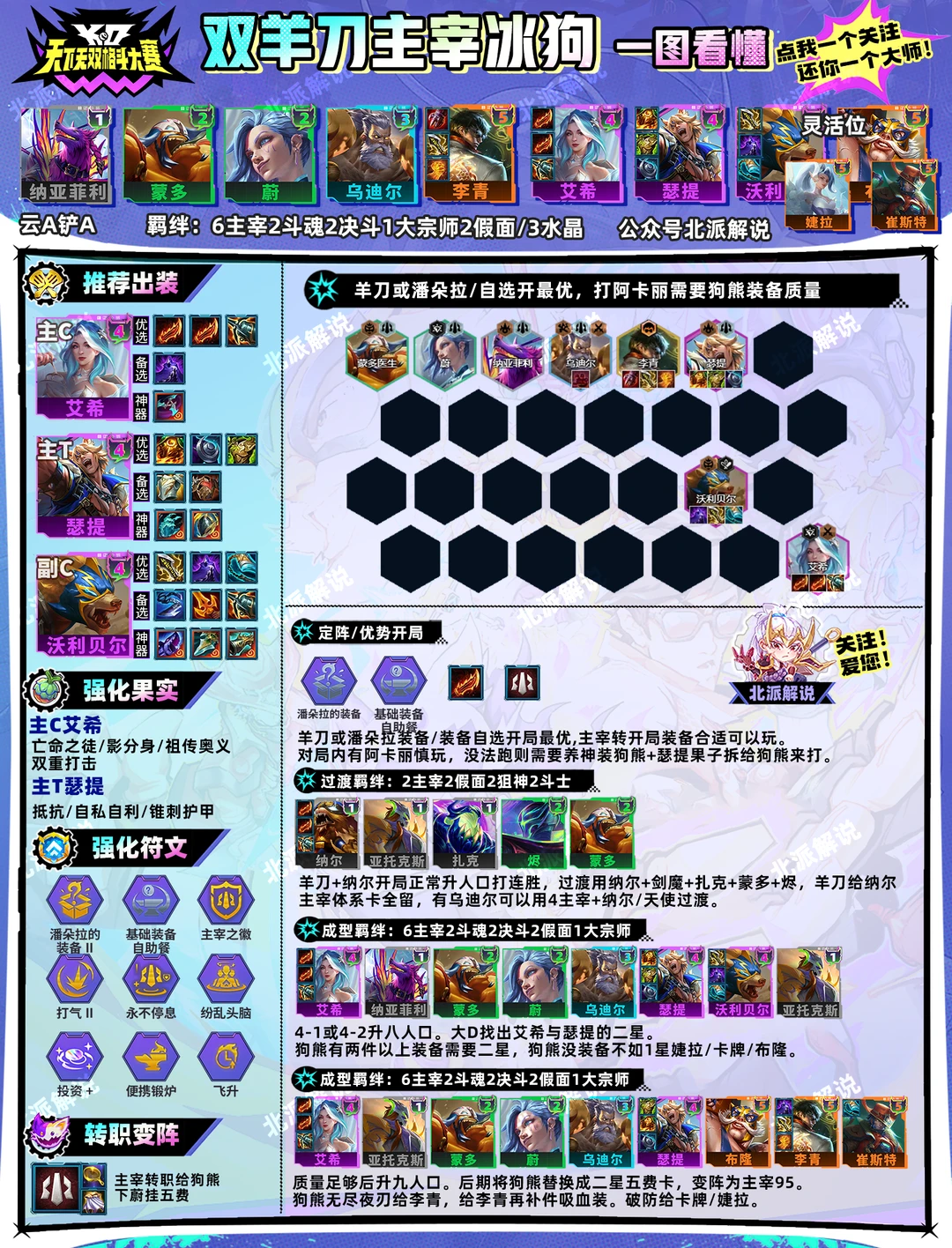 阵容强度:端游A铲不推荐 刚在电一宗师局中偷到一手主宰冰狗,阵容核心思路是艾希双羊刀+海妖叠攻击力,6主宰拖后期,还有一个灵活位有资源养狗熊,狗熊养不出挂5费,上九后找布隆/卡牌/婕拉三选二转成主宰95. 检索6主宰下,艾希装备的数据,双羊刀/羊刀迅刃+海妖的组合数据都非常亮眼,是主宰艾希标配三件。 对阵阿卡丽:可以通过站位有概率拉走阿卡丽的位置(前排右一和中间站人,右二右三空出来,艾希站右侧)可保躲阿卡丽前三个技能。但想赢阿卡丽最好是有神装狗熊+瑟提果子拆给狗熊。或者看外面对局有羊刀/大天使留圣盾牌时慎玩。 果实选择 艾希:亡命之徒、影分身、祖传奥义、双重打击 瑟提:抵抗、自私自利、锥刺护甲 定阵思路: 艾希刚需三个攻速,一定是保证装备能成型时再考虑。 ①开局符文有自选装备类潘朵拉装备/基础装备自助餐。合一送一/备战席便成装都亏模。想强行玩可以拿。 ②主宰转开,转职给狗熊提升阵容强度,还是需要装备合适再考虑。 ③多装备局,符文珍藏财宝/装备自选/战利品订阅,阵容后期可养艾希+三张五费,不怕装备多。 ④迅刃开,有羊刀散件能直接冲。