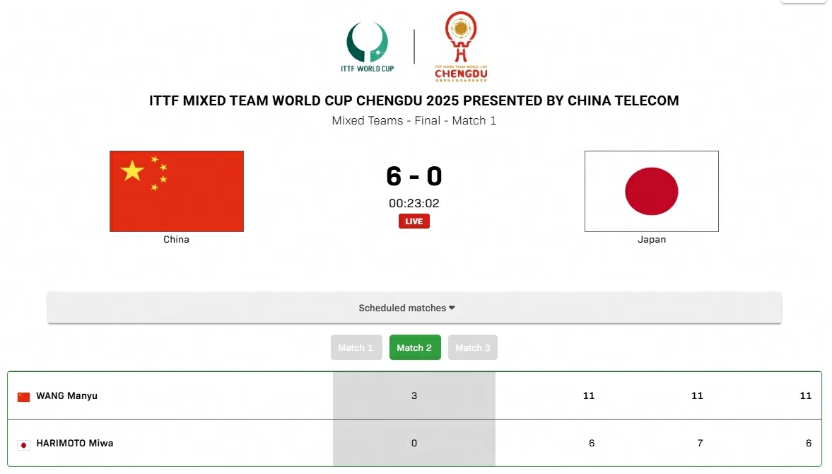 王曼昱3比0张本美和又一个3-0!国际乒联混合团体世界杯决赛,中国队vs日本队,第二盘,王曼昱3-0 完胜张本美和,比分为11-6、11-7、11-6。中国队大比分6-0领先!第三盘,林诗栋对阵张本智和