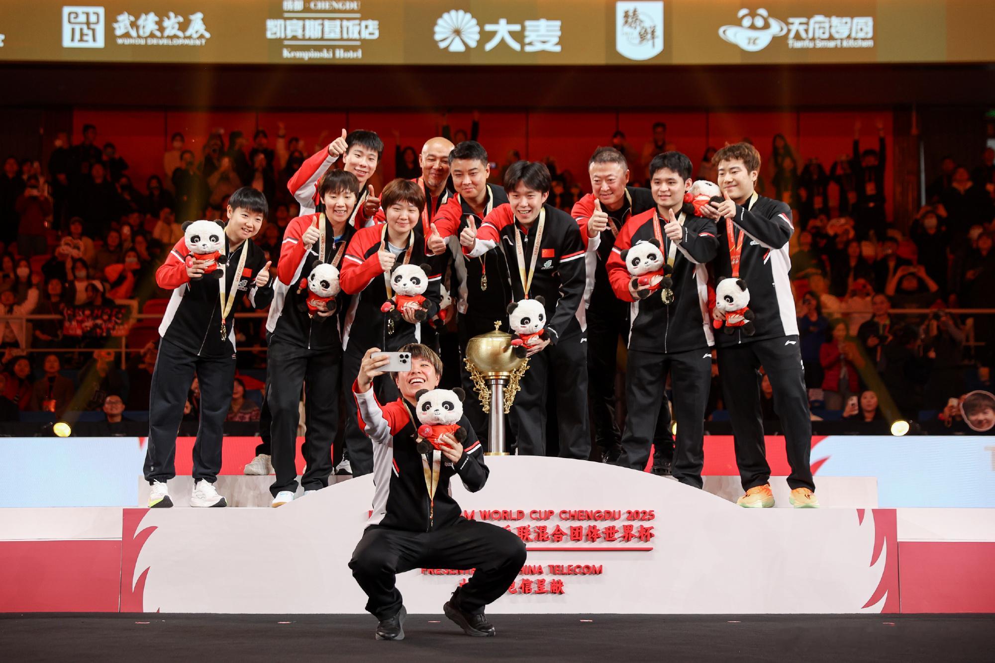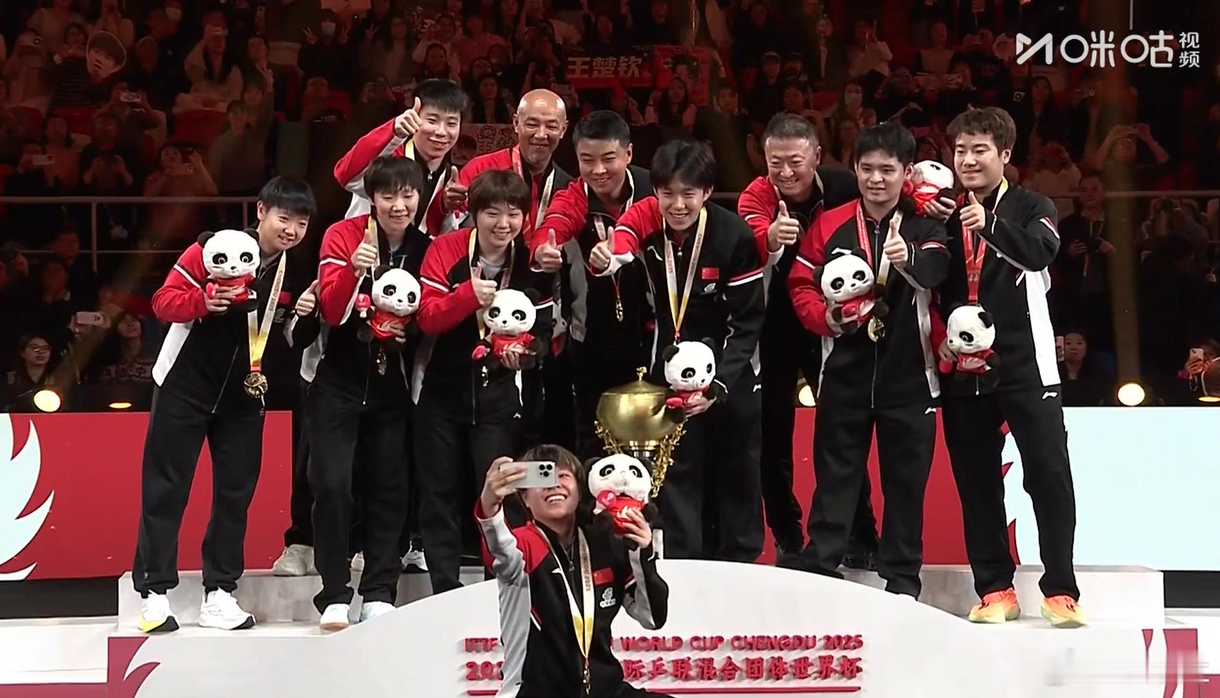 国乒混团冠军自拍国乒团魂具象化了 国乒是冠军!!!成都混合团体世界杯颁奖仪式现场,国乒拍摄冠军自拍! 通过直播画面可以看到,场下的教练员、运动员为台上全员鼓掌~