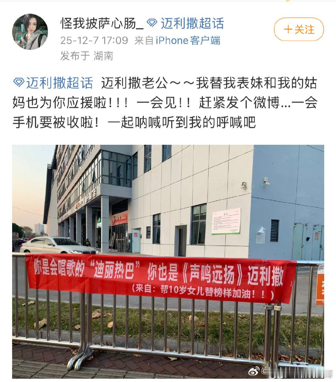 粉丝应援会唱歌的迪丽热巴声鸣远扬 迈利撒的应援甜度超标!妹宝和姑妈的横幅字字是真诚,句句藏偏爱,这样的暖心支持,真的会让人心软软~