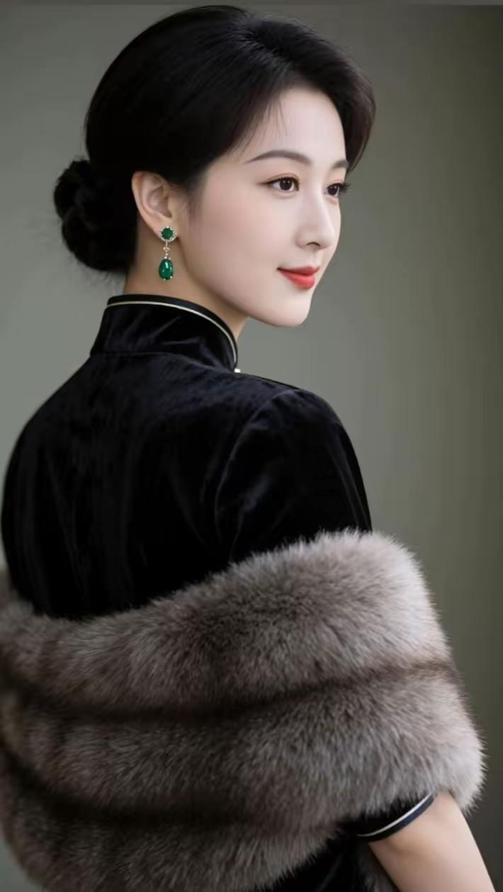 金字经·深紫旗袍佳人 紫缎旗袍俏, 灰貂披肩娇。 高髻轻妆韵意飘。 妖,身姿盈楚腰。 风华妙, 雅情尘世昭。