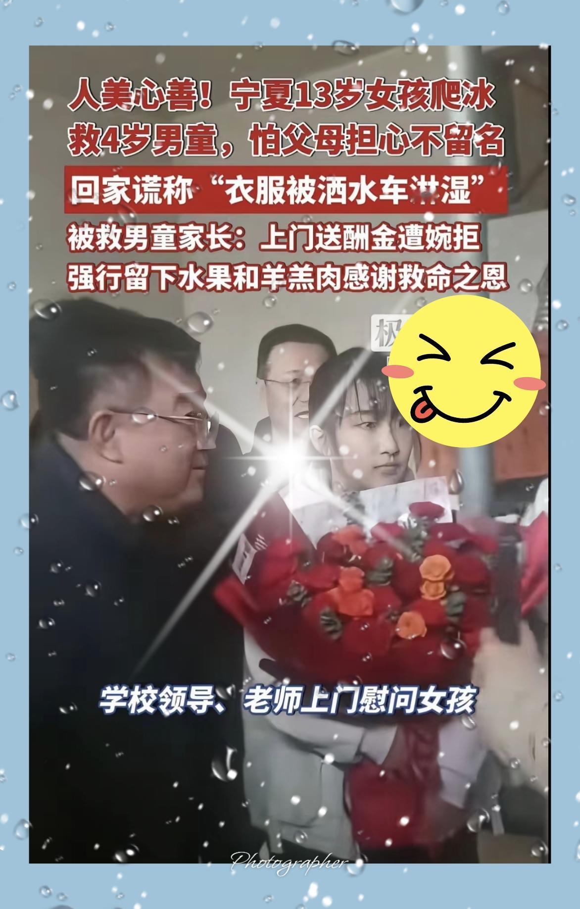 宁夏13岁女孩下冰窟救人后续!小女孩已经找到了,是同心县二中初一学生,目前学校领导已经知晓此事,不仅上门慰问了她,还准备在周一升旗仪式上当着全校同学的面表彰她。 这姑娘的举动真的戳中人心,崇拜消防员的她,凭着“体重轻冰层不易破”的单纯想法挺身而出,压根没顾上自己会不会有危险。更难得的是,救完人悄悄回家,还撒谎骗父母衣服是被洒水车淋湿的,这份善良里藏着的细腻,比勇敢更让人动容。 拒绝红包只收下心意,不想添麻烦的通透,哪像个13岁的孩子?其实英雄从不是天生的,而是关键时刻选择向善的普通人。她的行为不仅是见义勇为,更给我们上了一课:善良无需刻意标榜,勇敢也不必喊着口号。 学校的表彰和相关部门的申报,都是对这份纯粹善意的最好回应。我们总说需要正能量,其实正能量就藏在这样的少年身上。你觉得这份勇敢最打动你的地方是什么?来评论区聊聊~