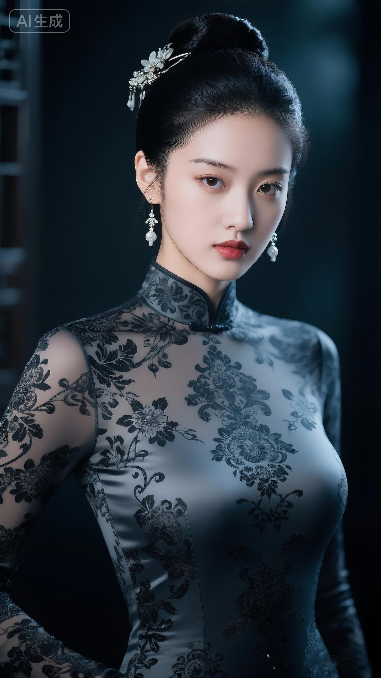 优雅古风美人,黑纱长裙,花钿点缀,古典韵味十足。