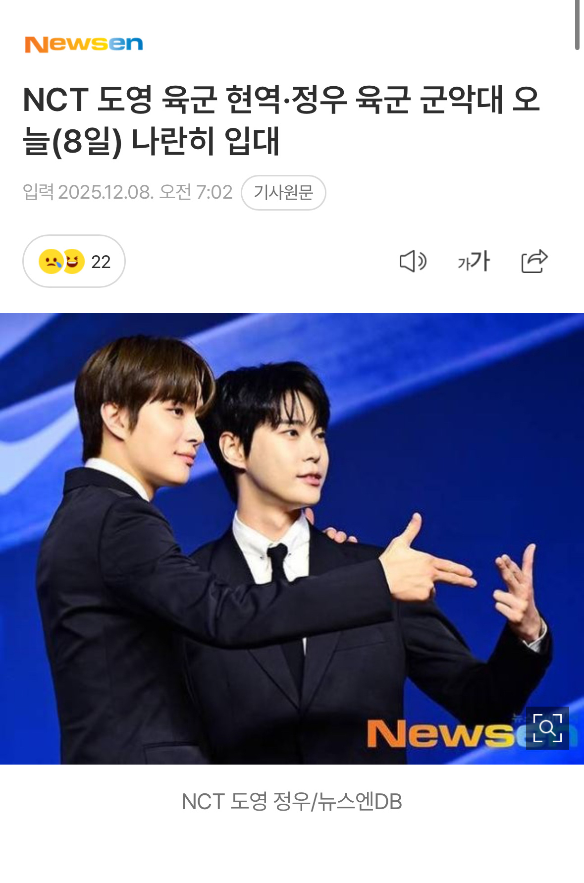 NCT道英x廷祐今日将同伴入伍 道英和廷祐将在12月8日一同进入训练所。道英将作为陆军现役兵、廷祐将作为陆军军乐队开始服兵役。 道英和廷祐是NCT中继去年4月入伍海军的泰容、11月入伍军乐队的在玹之后开始服兵役的成员。 经纪公司方面表示“为了道英和廷祐能够认真履行兵役义务,以更健康的面貌回归,请大家给予不变的爱与支持”。
