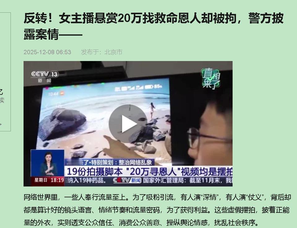你刚刷到的感人故事,可能是别人的"流量KPI"。 那个叫"宋雨霏"的女主播,悬赏20万寻找救命恩人,11集连续剧,从海边溺水到拜访母校,连36万勒索戏码都安排上了。结果呢?警方在她家搜出19份脚本、5份道具清单——这不是拍短视频,这是在拍《演员的诞生》。 这事儿恶心在哪儿? 它压根不是"为了火没底线"这么简单。现场搜出来的材料比正经剧组还专业,白纸黑字写着"情绪节点""涨粉目标"。8万粉丝,每个关注都是他们账本上的数字。你的眼泪,他们的带货佣金;你的转发,他们的广告报价。这叫"正能量剧本杀",杀的是你的同情心。 更可怕的是,这已经形成产业链了。从编剧到拍摄到引流,一条龙服务,专门收割"知恩图报"这份中国人最朴素的情感。他们算得比谁都精:真实故事没人看,必须加"20万悬赏"的钩子;平淡叙事没流量,必须塞"勒索36万"的冲突。每个桥段都是算法喂出来的,每个镜头都在计算转化率。 你发现没? 很多时候我们自己也在"配合演出"。 看到眼泪就点赞,遇到苦难就转发,恨不得把"善良"俩字刻在脸上。可一次次"狼来了"之后,真正的求助会是什么样?四川暴雨时,有人真遇险了,评论区第一条是"是不是摆拍"。这不是网友的错,是假剧本把真求救的信道堵死了。 怎么办? 下次再看到那种"完美得不像话"的感动,先别急着共情。没标注"剧情演绎"的,一律按剧本处理。去官方账号交叉验证,等蓝底白字通报。最关键的是—— 直接取关,别给眼神 。流量是门生意,你不买单,他们就活不下去。 最后想说,善良不是错,但善良需要"防骗疫苗"。毕竟,我们的同情心很贵,不该成为别人的变现工具。你说呢?