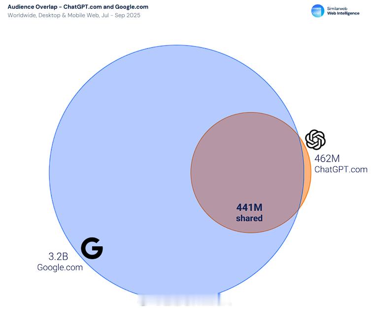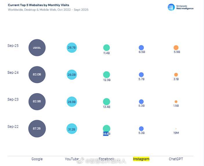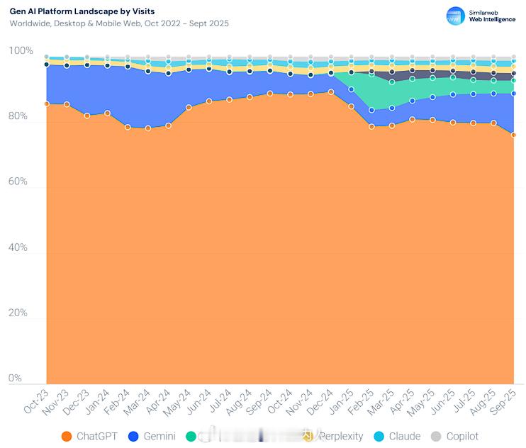 统计公司Smilarweb数据,生成式AI正从娱乐新奇工具演变为互联网基础设施的核心层。今年9月全球AI服务月访问量达到约70亿次,同比增长76%,流量规模已可与主流社交网络匹敌。移动端的扩张更为迅猛,AI应用会话量在过去一年增长了五倍,应用下载量飙升778%。ChatGPT以59亿次访问量占据近80%市场份额,跻身全球前五大网站。用户结构呈现分化:18-34岁仍占主导,但45岁以上群体增速最快,占比近30%。值得注意的是,95%的ChatGPT用户同时使用Google,全球市场AI与搜索引擎呈并行使用模式(这点和国内有很大的区别)。