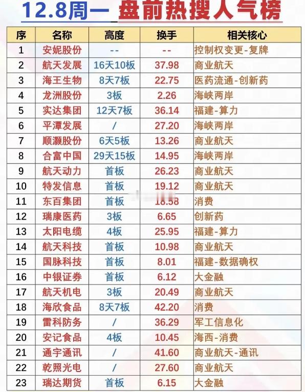 12.8盘前热搜人气榜梳理分析!本次梳理聚焦当前市场关注的多类主线赛道:商业航天是核心热点(多只个股上榜),覆盖产业链不同环节;海西(海峡两岸、福建)相关个股依托区域区位布局业务;同时包含医药(创新药)、消费、大金融、军工信息化等板块标的,反映市场短期关注的产业与区域方向。个股梳理分析1. $安妮股份 sz002235$ :核心关联控制权变更,自身业务涵盖版权服务、商务信息用纸等,此次复牌后需关注新实控方带来的业务调整或资源整合,后续业务方向或随控制权变动出现新布局。2. $航天发展 sz000547$ :聚焦商业航天领域,业务覆盖航天技术研发、装备配套等,是商业航天产业链的核心参与者,在卫星应用、航天配套服务等环节有成熟布局。3. $海王生物 sz000078$ :布局医药流通与创新药领域,是区域医药流通龙头之一,同时参与创新药的研发与合作,业务涵盖药品分销、零售及创新药管线推进。4. 龙洲股份:关联海峡两岸概念,自身主营道路运输、汽车制造等业务,后续或依托区域定位,拓展与海峡两岸相关的物流、贸易配套服务。5. 实达集团:涉及福建算力概念,业务涵盖电子信息产品、算力基础设施配套等,在福建区域布局算力相关硬件与服务支持,适配区域数字经济发展需求。6. 平潭发展:关联海峡两岸概念,以林业、建材业务为核心,同时布局区域综合开发,依托平潭区位优势,后续或参与海峡两岸相关产业合作项目。7. 顺灏股份:参与商业航天领域,同时经营新型烟草、环保包装等业务,在商业航天板块中,主要提供相关材料、配套产品的供应服务。8. 合富中国:关联海峡两岸概念,专注医疗流通领域,提供体外诊断产品的分销、物流服务,依托海峡两岸医疗产业资源拓展业务合作。9. 航天动力:聚焦商业航天,核心业务是航天动力系统、流体机械的研发制造,是商业航天运载火箭、航天器动力部件的重要供应商。10. 特发信息:涉及商业航天,主营通信设备、光纤光缆等产品,在商业航天领域提供卫星通信、航天测控所需的通信配套支持。11. 东百集团:关联消费概念,是商业零售企业,业务涵盖商业综合体运营、仓储物流等,聚焦消费场景运营,适配消费复苏的市场需求。12. 瑞康医药:布局创新药领域,是医药流通企业,同时参与创新药的代理、推广业务,覆盖创新药的流通与终端服务环节。13. 太阳电缆:涉及福建算力概念,主营电线电缆制造,在福建算力基础设施建设中,提供算力机房、数据中心所需的电缆配套产品。14. 航天科技:参与商业航天,业务涵盖航天产品研发、卫星应用等,是商业航天产业链中卫星制造、发射服务配套的核心企业之一。15. 国脉科技:涉及福建数据确权概念,聚焦通信技术服务、数字经济基础设施业务,在数据确权领域布局数据要素的管理与服务相关业务。16. 中银证券:关联大金融概念,是综合性券商,业务涵盖证券经纪、投行、资管等,是大金融板块的核心标的之一。17. 航天机电:涉及商业航天,业务包括航天配套设备、新能源等,在商业航天领域提供航天器相关的机电部件、配套系统产品。18. 海欣食品:关联消费概念,专注休闲食品、速冻食品的研发生产,是食品消费领域的区域龙头,产品覆盖休闲零食、速冻调理食品等品类。19. 雷科防务:布局军工信息化领域,业务涵盖雷达系统、电子对抗等军工信息化产品的研发制造,是军工信息化板块的核心参与企业。20. 安记食品:关联海西消费概念,专注调味品研发生产,产品包括复合调味粉、酱料等,依托海西区域消费市场拓展终端销售。21. 通宇通讯:涉及商业航天-通讯领域,主营通信天线、射频器件制造,在商业航天中提供卫星通信、航天测控所需的通信天线配套。22. 乾照光电:参与商业航天,主营半导体光电产品研发制造,在商业航天领域提供航天器所需的光电器件、半导体材料等配套产品。23. 瑞达期货:关联大金融概念,是期货公司,业务涵盖期货经纪、资管、风险管理等,属于大金融板块中的期货领域标的。总结今日人气榜个股集中在商业航天、海西、消费、医药、大金融等赛道,其中商业航天是最核心的热点主线,多只个股覆盖该产业链的动力、通信、配套等环节;海西相关个股依托区域区位拓展对应业务;消费、医药等标的则适配市场需求方向。这些个股的热度关联自身业务赛道与当前市场主线,但后续需结合业务落地进度、行业政策关注业绩实际兑现情况。本文涉及资讯、数据等内容来自网络公共信息,仅供参考,不构成投资建议!