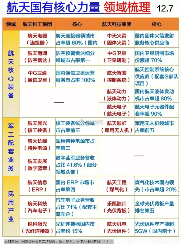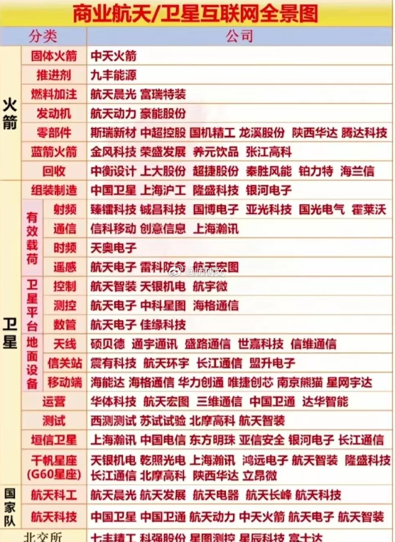 商业航天概念人气龙头梳理!周末重磅消息,年产1000颗卫星的超级工厂即将投产,可实现“卫星出厂即发射”的无缝衔接。国内商业航天2025年市场规模预计达2.8万亿元,2030年有望逼近10万亿元。相关概念受益龙头企业有哪些?国资控股航天概念人气代表有$航天科技 sz000901$ 、$航天电子 sh600879$ 等等。商业航天产业链细分龙头代表有$天箭科技 sz002977$ 、西部材料等等。航天科技主营业务包括航天应用产品,央企航天科工集团控股上市 ,三季度净利润同比976.78%。西部材料是稀有金属领域领先企业,陕西国资控股上市公司。(理财有风险入市需谨慎,资料取材网络仅供参考不构成任何投资建议!)