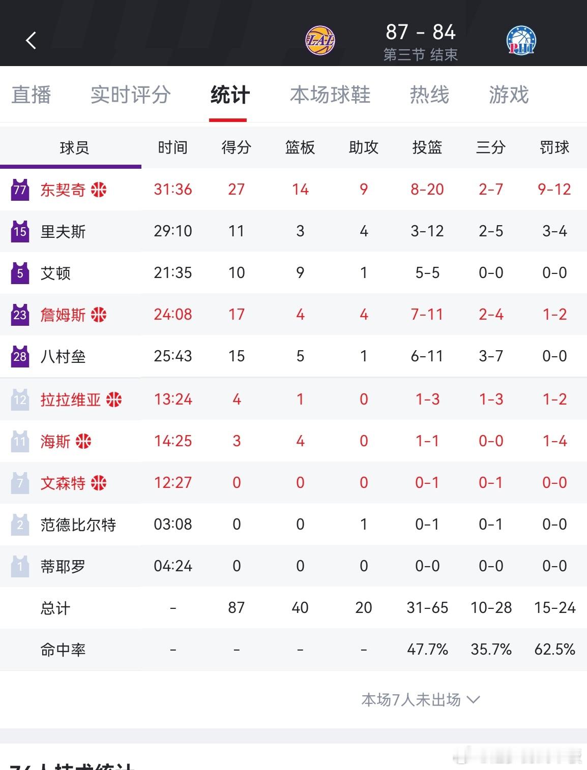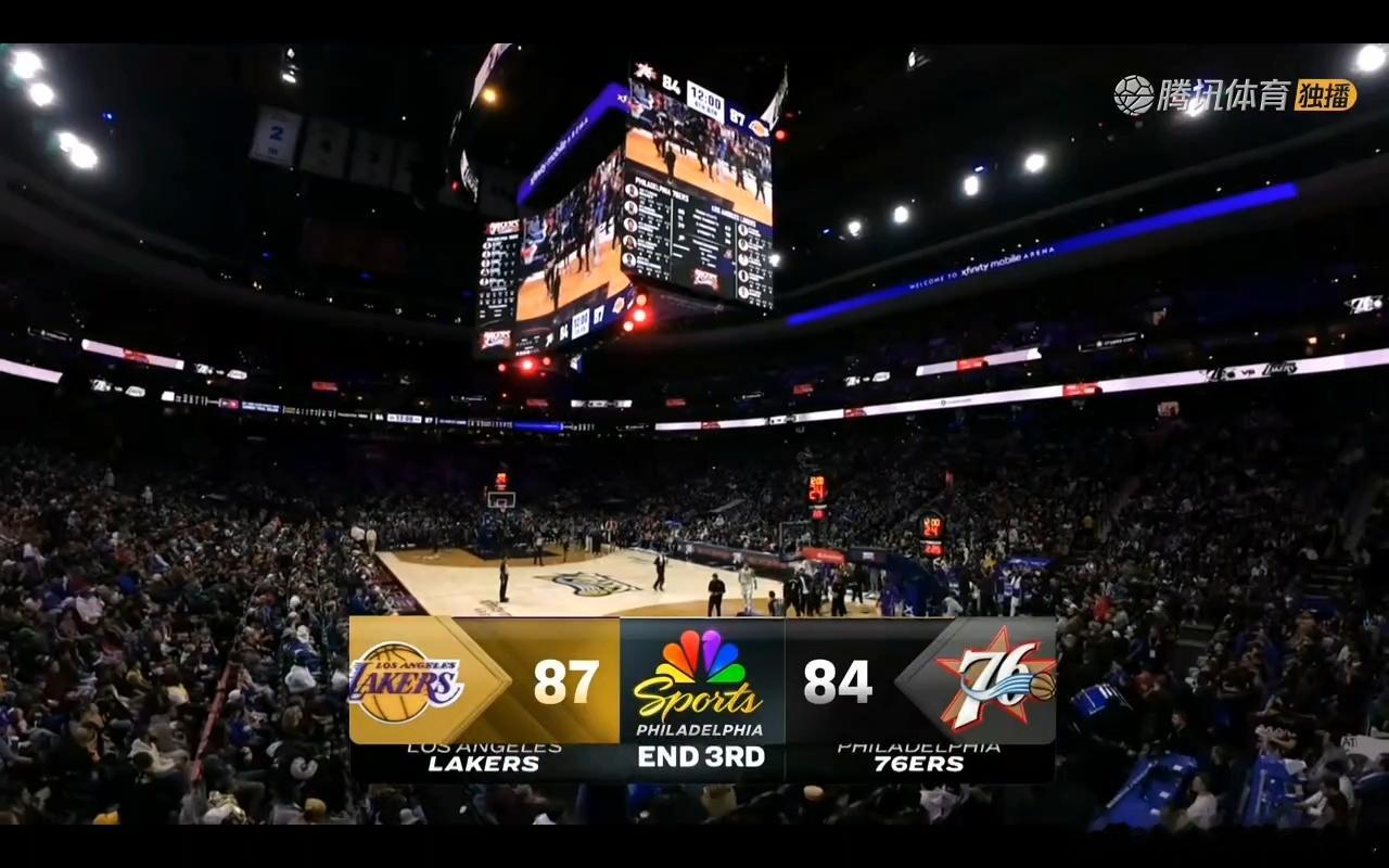 湖人反超3分进入第四节,东契奇27分14板9助,詹姆斯17分湖人vs76人
