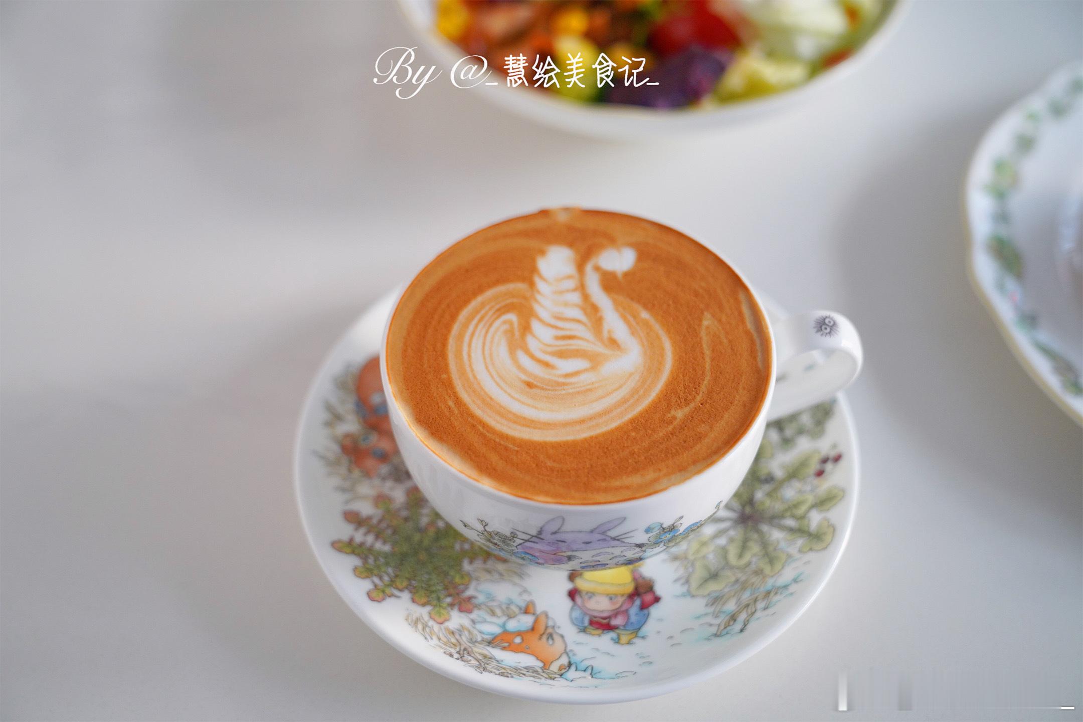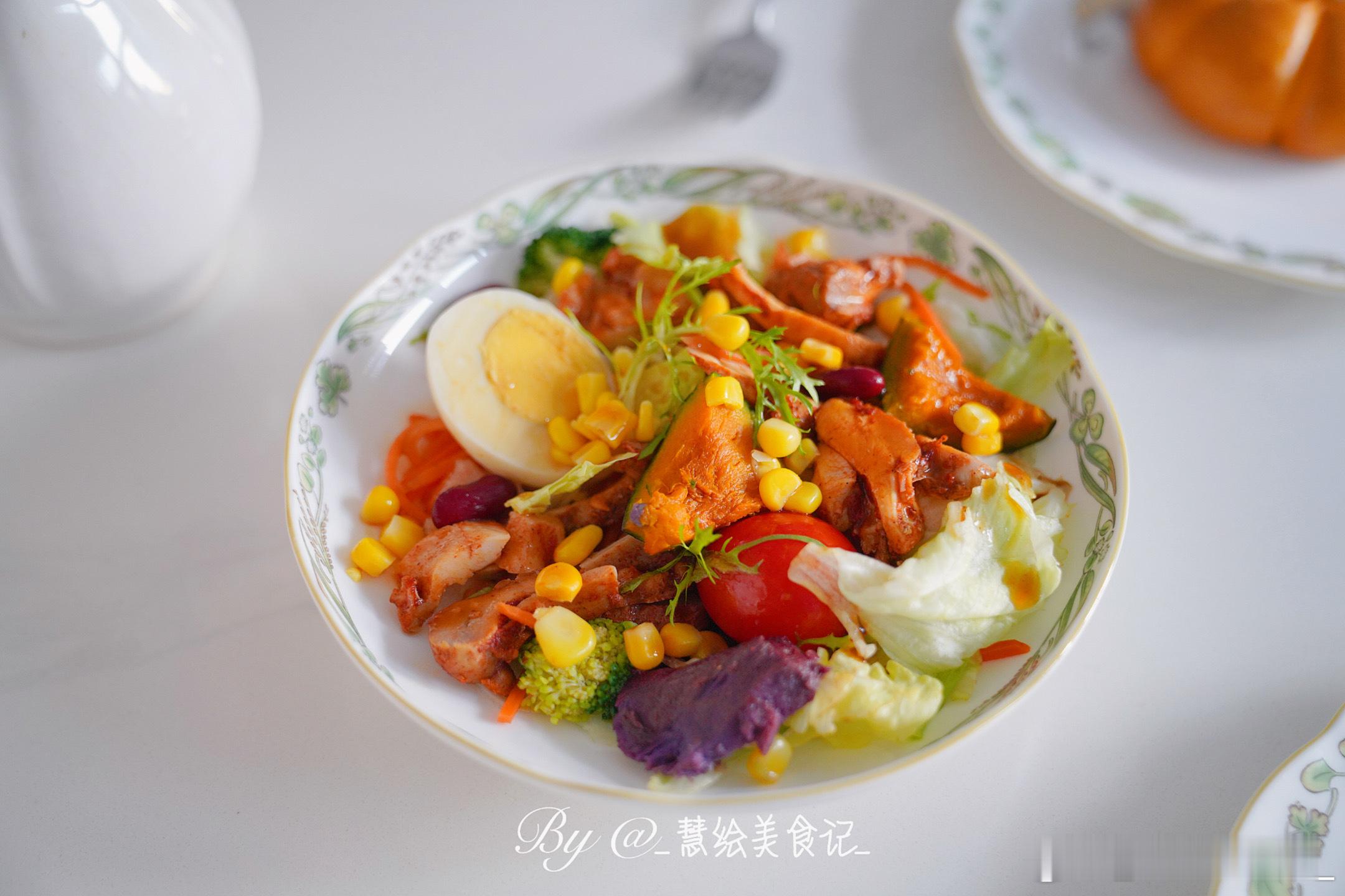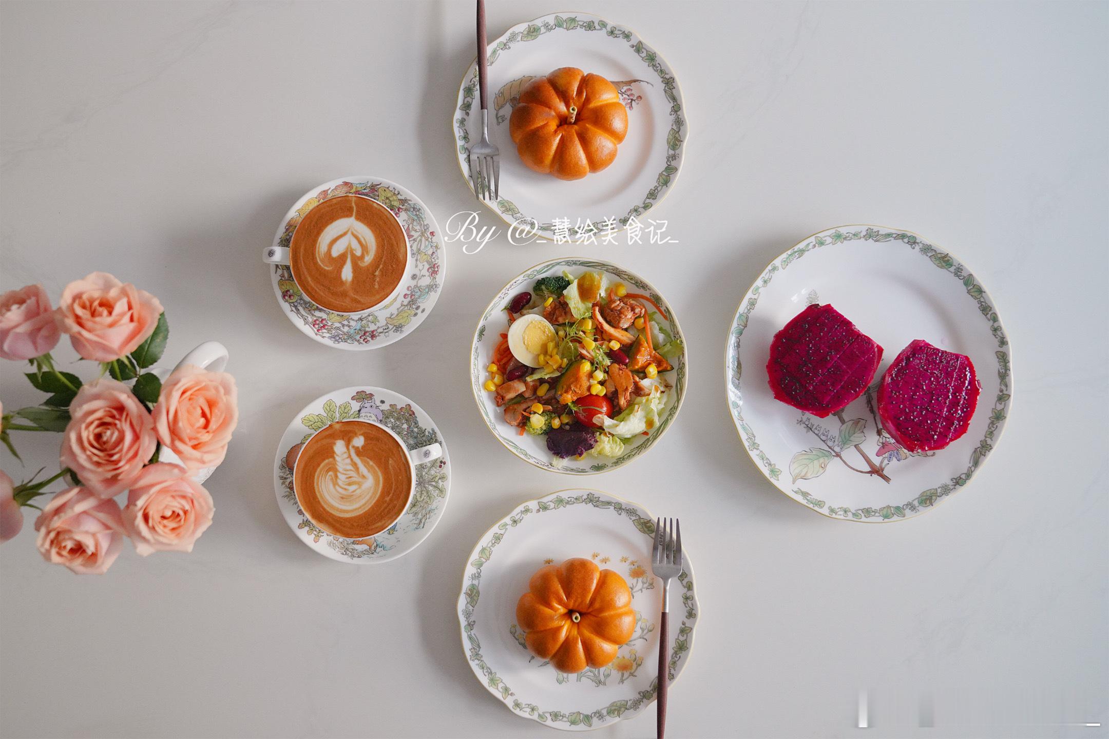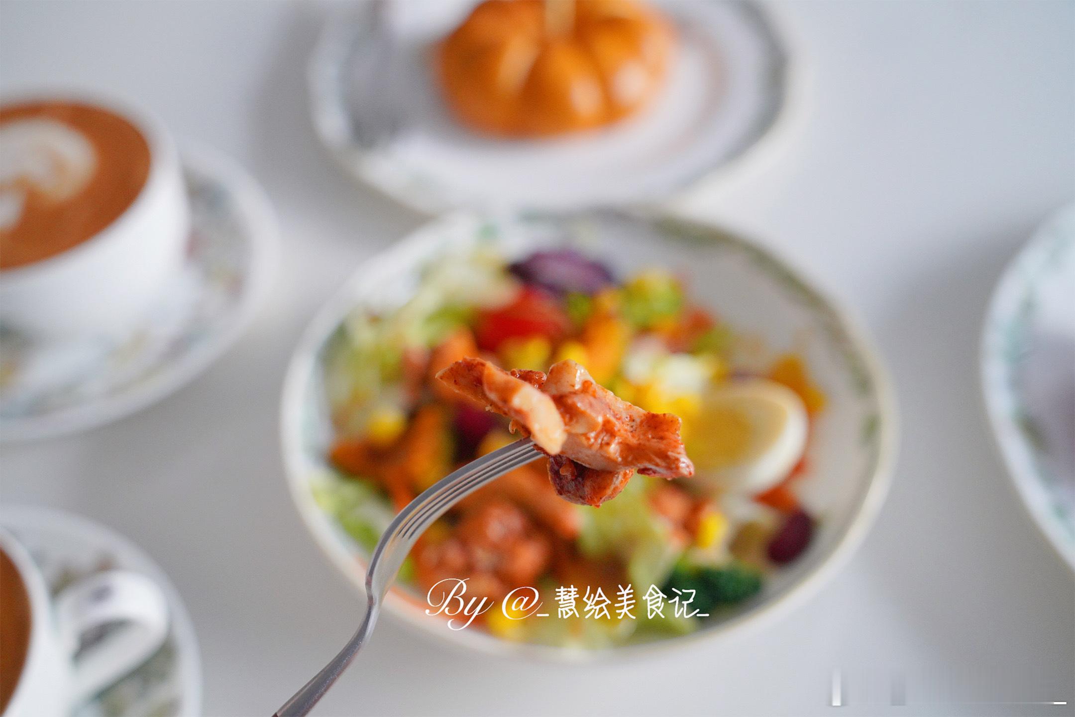 新周愉快早餐南瓜贝果、鸡肉蔬菜沙拉、拿铁咖啡~温暖的时光