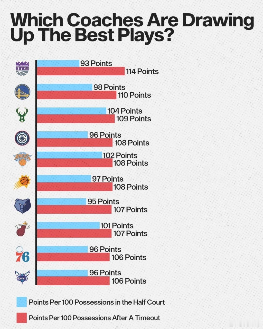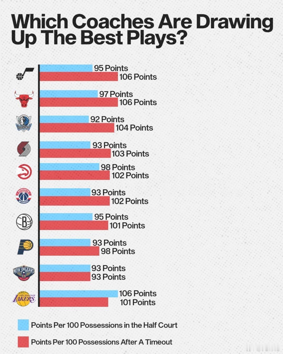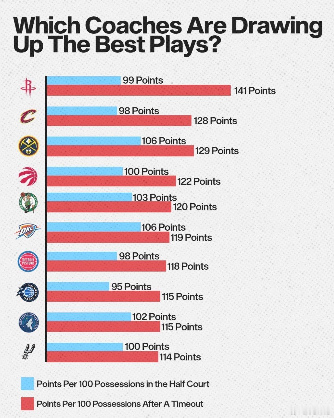 哪些教练在暂停时做出最好的调整?球队暂停前后得分效率数据差的排名👀蓝色:半场阵地战每百回合得分红色:暂停后每百回合得分99分 → 141分火箭队教练组在暂停布置后效率提升是排联盟第一休斯顿火箭你们不是都说乌指不懂求? 服不服?
