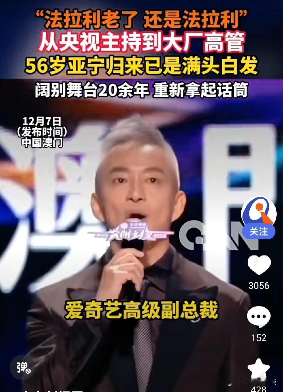 前“央视最帅主持人”亚宁重回舞台东方亚宁 2025年12月6号,在澳门的爱奇艺尖叫之夜上,56岁的前央视主持人亚宁复出担任主持。上世纪90年代,他主持的《中国音乐电视》《同一首歌》等栏目火遍全国,《同一首歌》的旋律更是一代人的青春BGM。 亚宁坦言二十多年没主持,心里没底。早在十月底他就发视频宣布回归,还提到手都有点抖。爱奇艺请他也是想借名气拉回老观众。网友都说“法拉利老了也是法拉利”,他往那一站就有分量。和现在一些靠美颜、蹭热点的人比起来,亚宁安静消失多年后回归,更让人觉得珍贵。