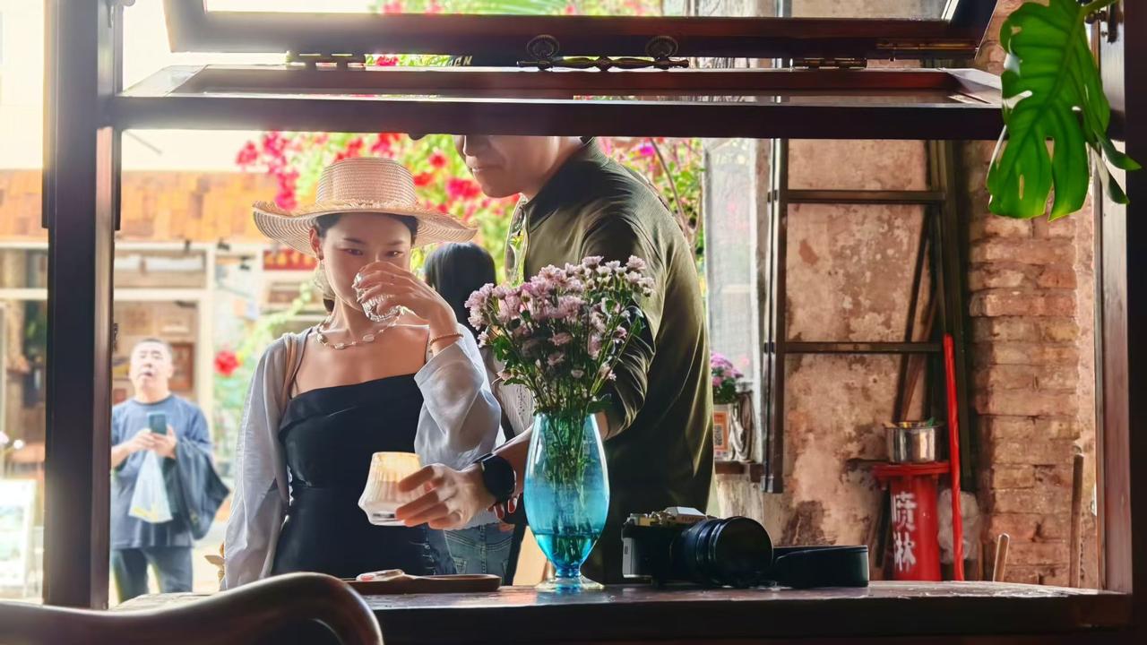 窗边的光裹着三角梅的艳,花束浸在冰蓝的瓶里,连玻璃杯的凉都沾了软风的甜。日子就该这样,把闲情妥帖在烟火与温柔的缝隙里。